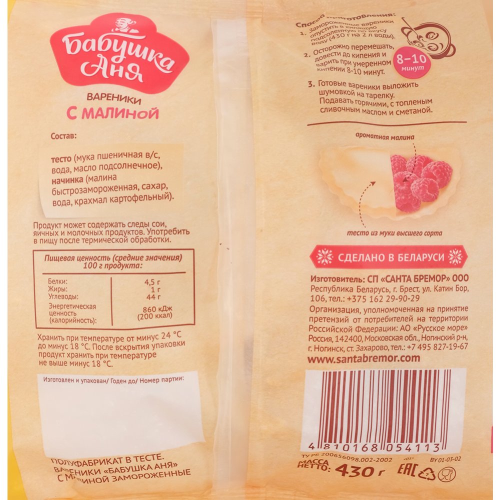 | Состав | тесто (мука пшеничная в/с, вода, масло подсолнечное), начинка (малина быстрозамороженная, сахар, вода, крахмал картофельный). |