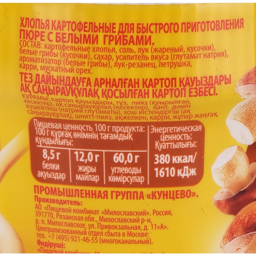 | Состав | картофельные хлопья, соль, лук (жареный, кусочки), белые грибы (кусочки), сахар, усилитель вкуса (глутамат натрия), ароматизатор (белые грибы), лук-резанец, петрушка, карри, мускатный орех. |