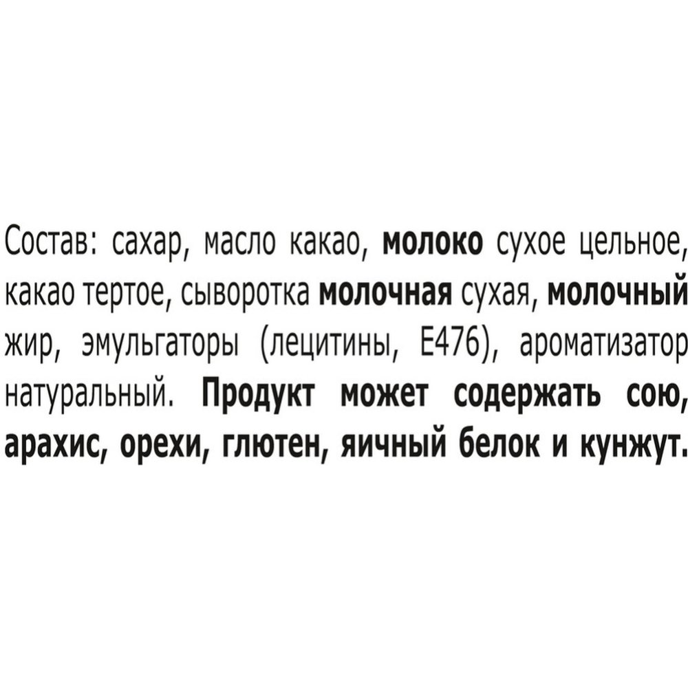 | Состав | сахар, масло какао, молоко сухое цельное, какао тертое, сыворотка молочная сухая, молочный жир, эмульгаторы (лецитины, Е476), ароматизатор натуральный. В шоколадной массе: сухой общий остаток какао – не менее 25 %, сухой обезжиренный остаток какао – не менее 2,5 %, сухой молочный остаток – не менее 12 %, молочный жир – не менее 2,5 %. |