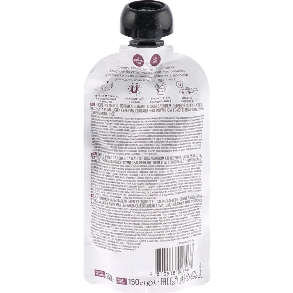 | Состав | пюре яблочное, пюре персиковое, пюре из манго, пищевое волокно (инулин), сок лимонный концентрированный (регулятор кислотности), экстракт ромашки, куркума молотая. |