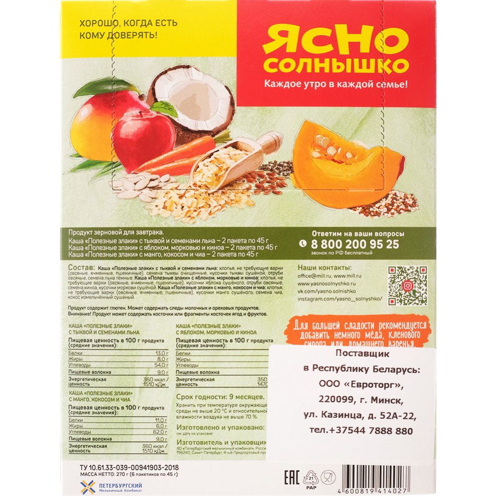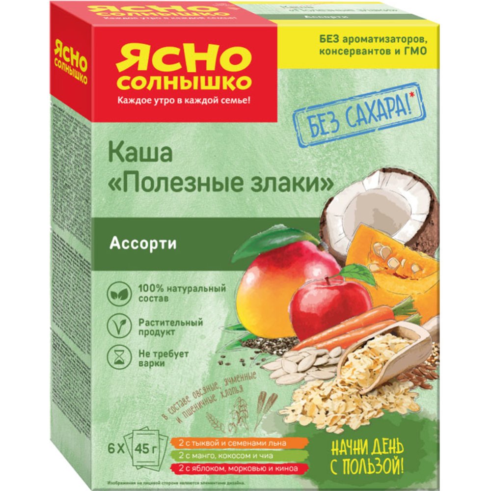 | Краткое описание | Каша ассорти "Полезные злаки" - это коллекция супер фудов, супер пользы, хорошего настроения - и все в одной коробке. Новинка придется по вкусу тем, кто предпочитает натуральные и качественные продукты на разнозлаковой цельнозерновой основе без ароматизаторов, консервантов и ГМО. Тем, кто заботится о своем здоровье и выбирает на завтрак кашу БЕЗ содержания сахара с полезными природными добавками! Новинка в ассортименте бренда "Ясно солнышко" отвечает последним тенденциям рынка о правильном питании. |