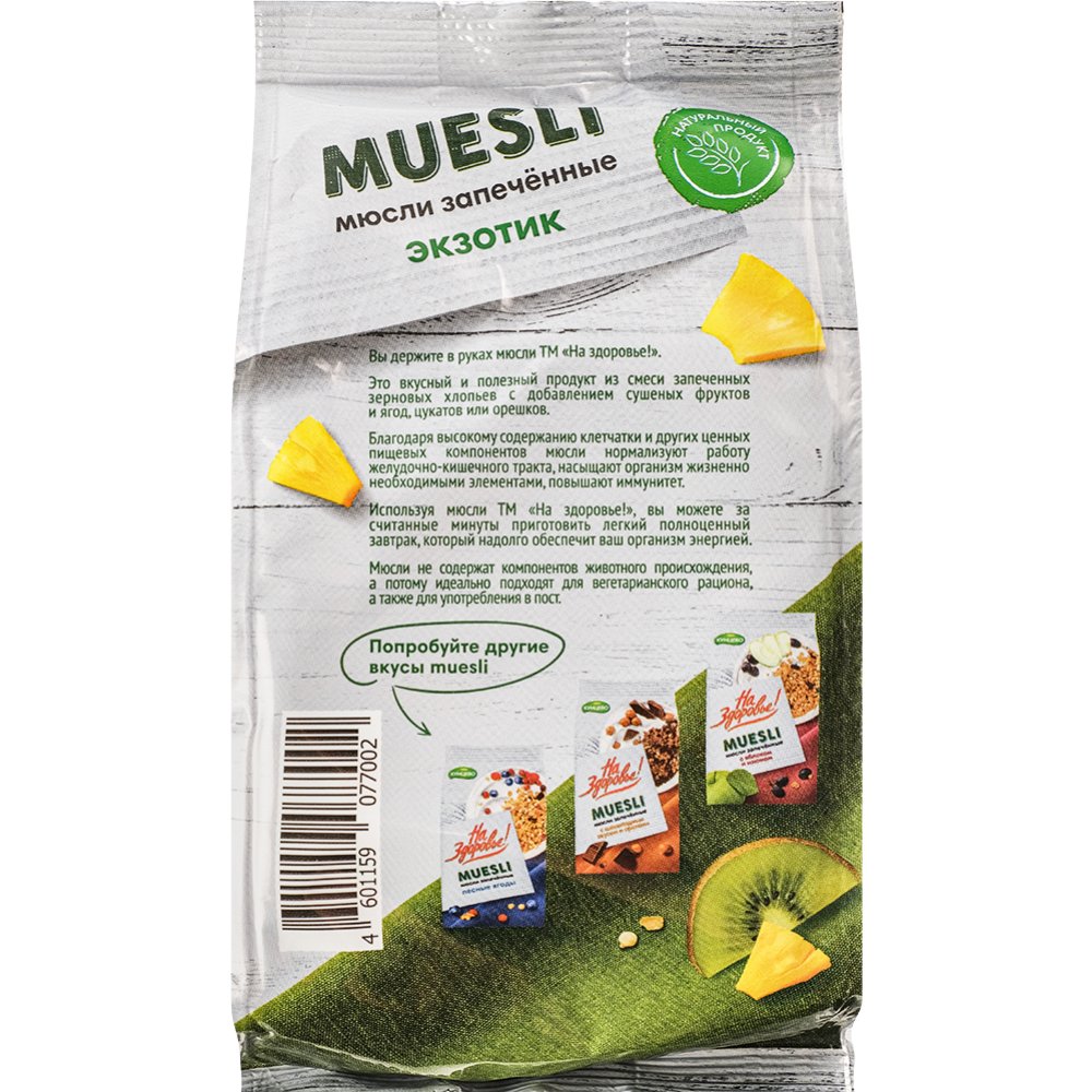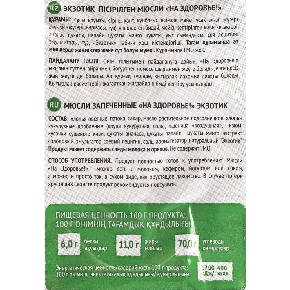 | Состав | хлопья овсяные, патока, сахар, масло растительное, хлопья кукурузные дробленые (крупа кукурузная, соль), пшеница «воздушная», изюм, кусочки сушеного киви, цукаты ананаса, цукаты папайи, цукаты манго, экстракт солодовый, эмульгатор соевый лецитин, соль, ароматизатор натуральный «Экзотик». Продукт может содержать следы молока и орехов. |