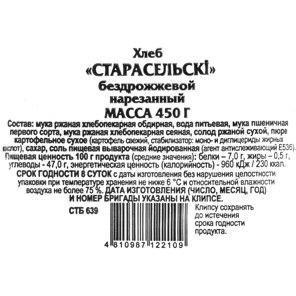 | Состав | мука ржаная хлебопекарная обдирная, вода питьевая, мука пшеничная первого сорта, мука ржаная хлебопекарная сеяная, солод ржаной сухой, пюре картофельное сухое (картофель свежий, стабилизатор: моно- и диглицериды жирных кислот), саха, соль йодированная. |