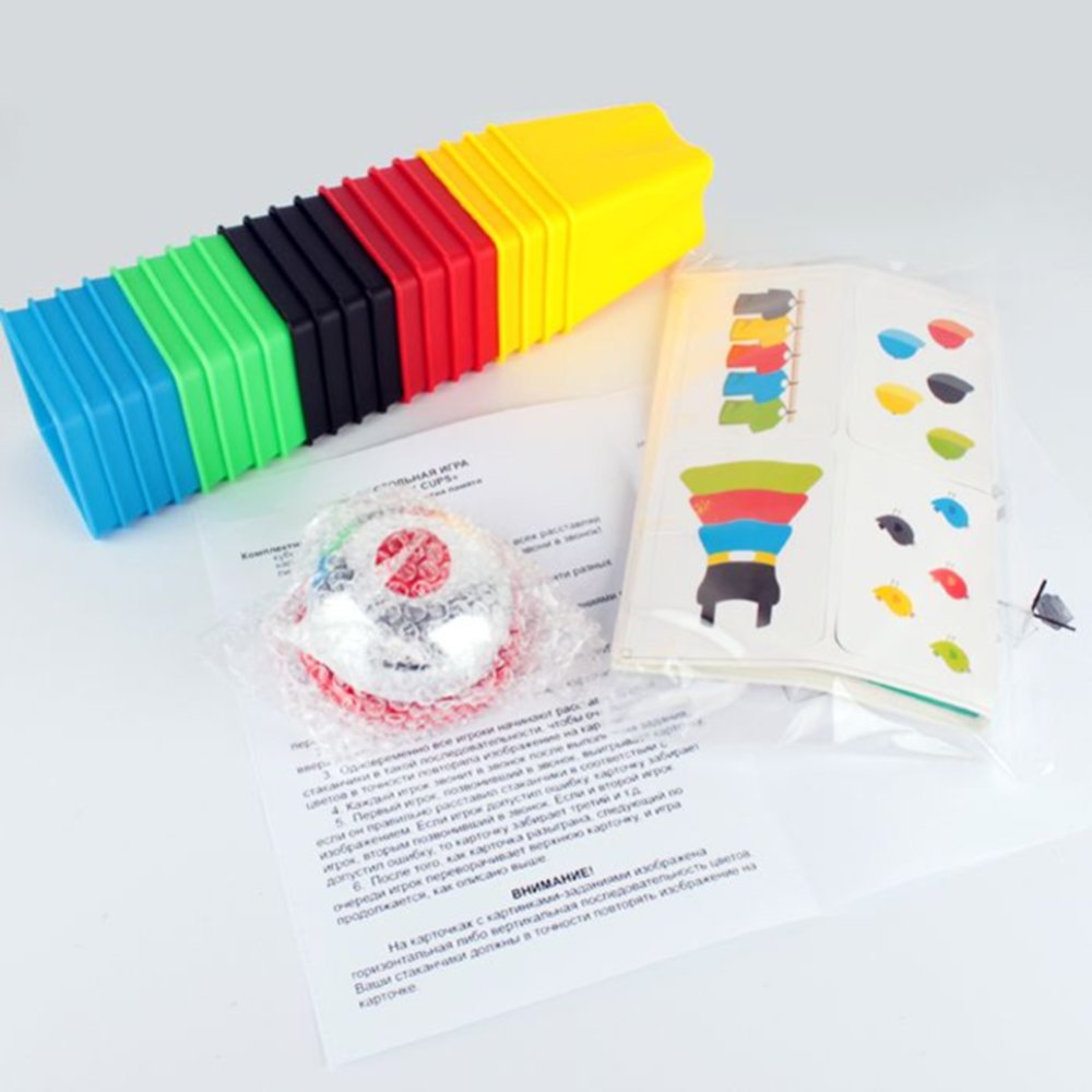 | Краткое описание | Собери больше всех карточек. Быстрее всех расставляй стаканчики в порядке, указанном на рисунке, и звони в звонок! Каждый игрок берет себе по 5 стаканчиков разных цветов. Расположить звонок в центре стола. Перемешать колоду карточек и положить заданиями вниз рядом со звонком. |