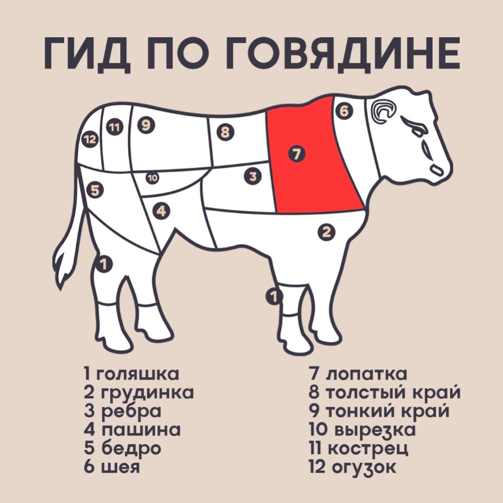 | Краткое описание | "Говяжья лопатка считается универсальным мясом. Это часть туши с небольшим количеством жира. В лопатке мало соединительной ткани и практически нет сухожилий. Данный вид мяса идеально подходит для отваривания, томления и тушения, также часто из него готовят рубленые котлеты, супы, гуляш и стейки." |