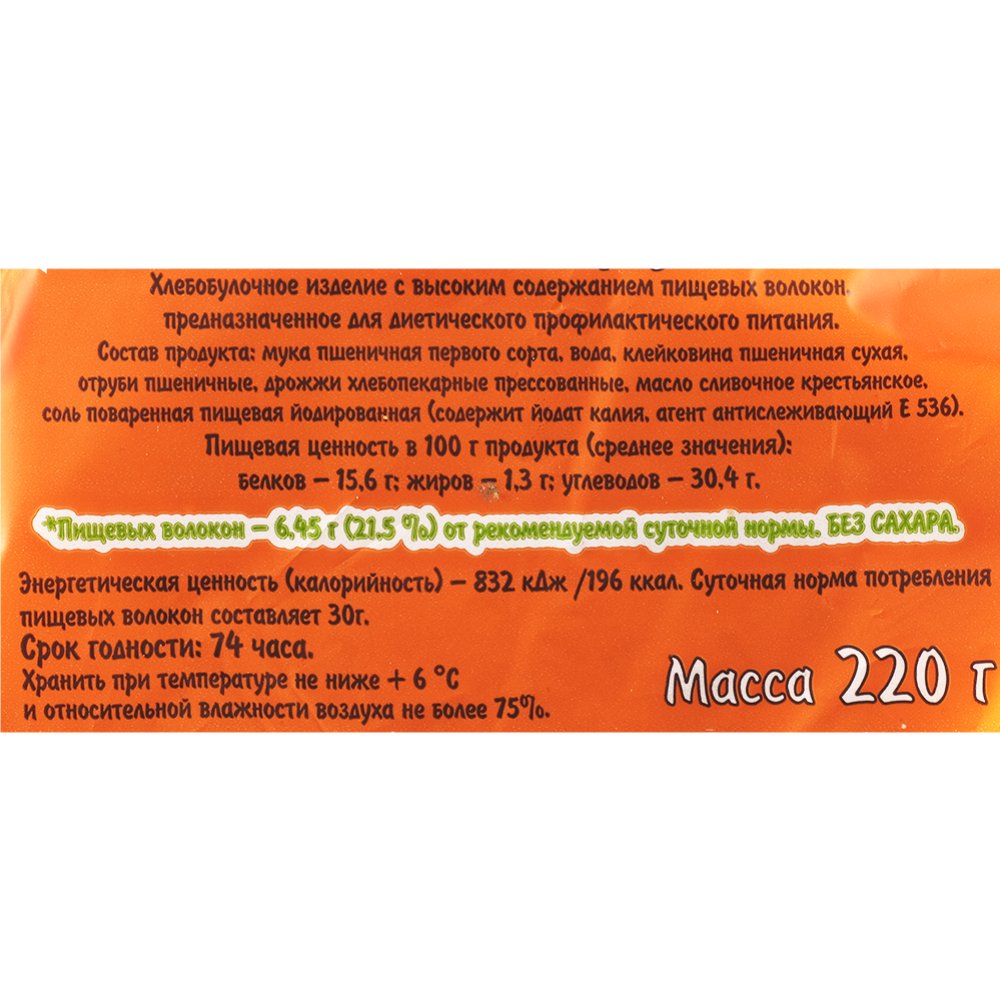 | Состав | мука пшеничная первого сорта, вода, клейковина пшеничная сухая, отруби пшеничные, дрожжи хлебопекарные прессованные, масло сливочное крестьянское, соль поваренная пищевая йодированная (содержит йодат калия, агент антислеживающий Е 536). |