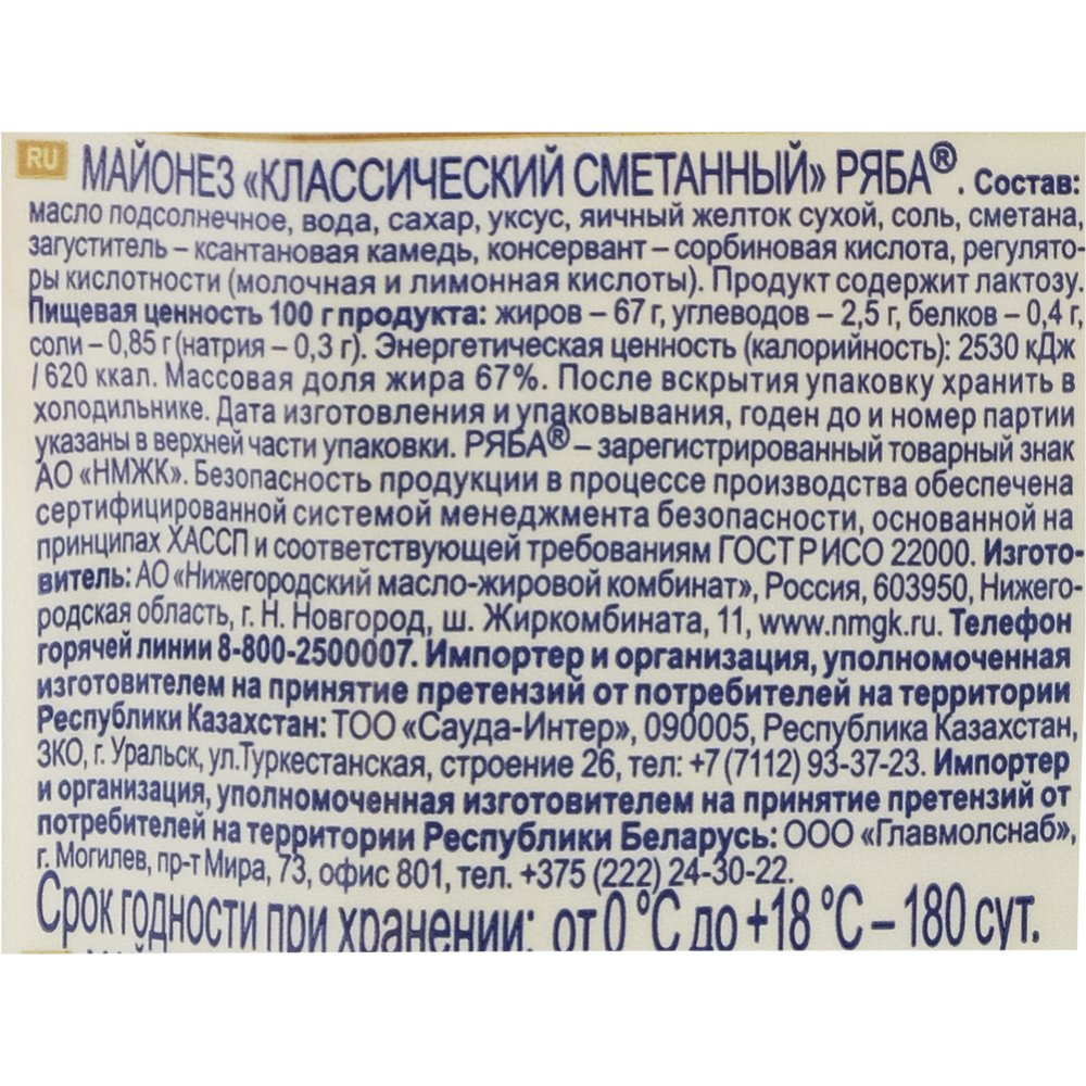 | Состав | Масло подсолнечное, вода, сахар, уксус, яичный желток сухой, сметана, соль, загуститель- ксантонтановая камедь, регуляторы кислотности (молочная и лимонная кислоты), консервант -сорбиновая кислота. Продукт содержит лактозу. |