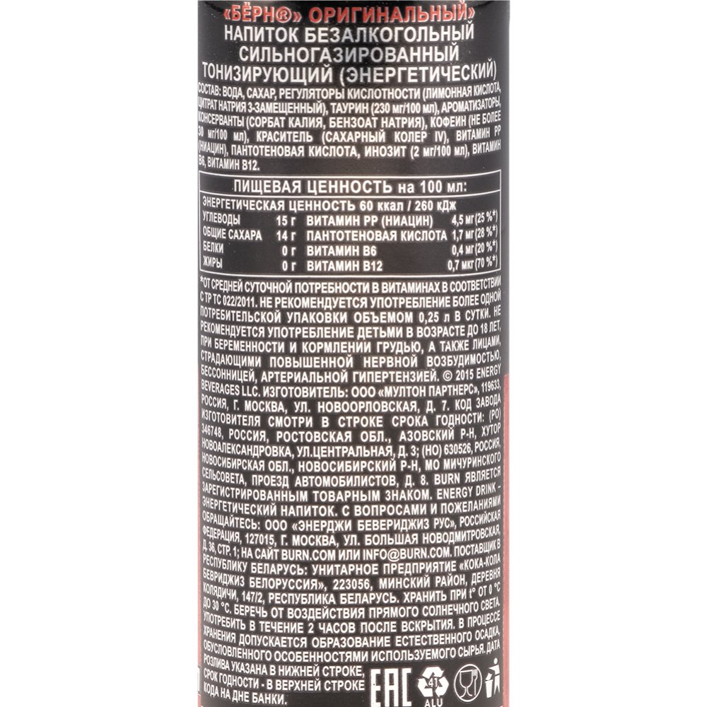 | Состав | вода, сахар, регуляторы кислотности (лимонная кислота, цитрат натрия 3-замещенный), таурин, (230мг/100 мл), ароматизаторы, консерванты (сорбат калия, бензоат натрия), кофеин (не более 30 мг/100 мл), краситель (сахарный колер IV), витамины (PP (ниацин), пантотеновая кислота), инозит (2 мг/100мл), витамин B6, витамин B12. |