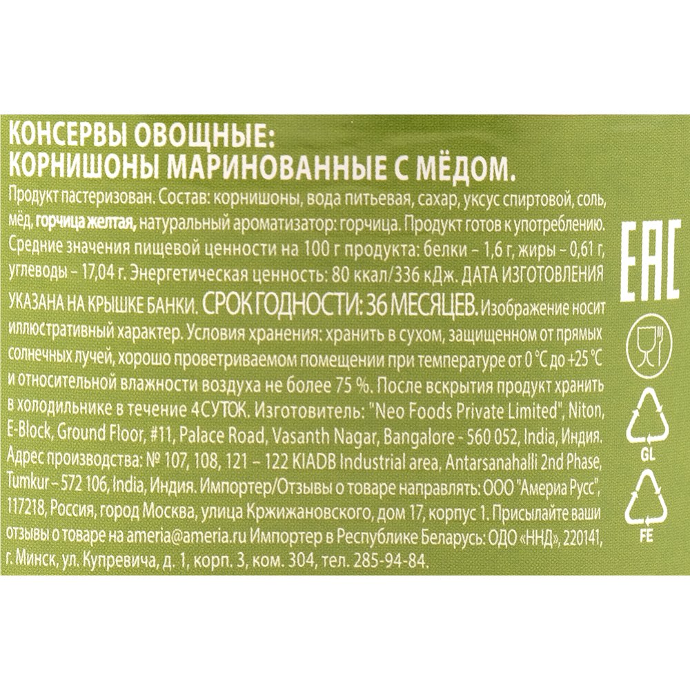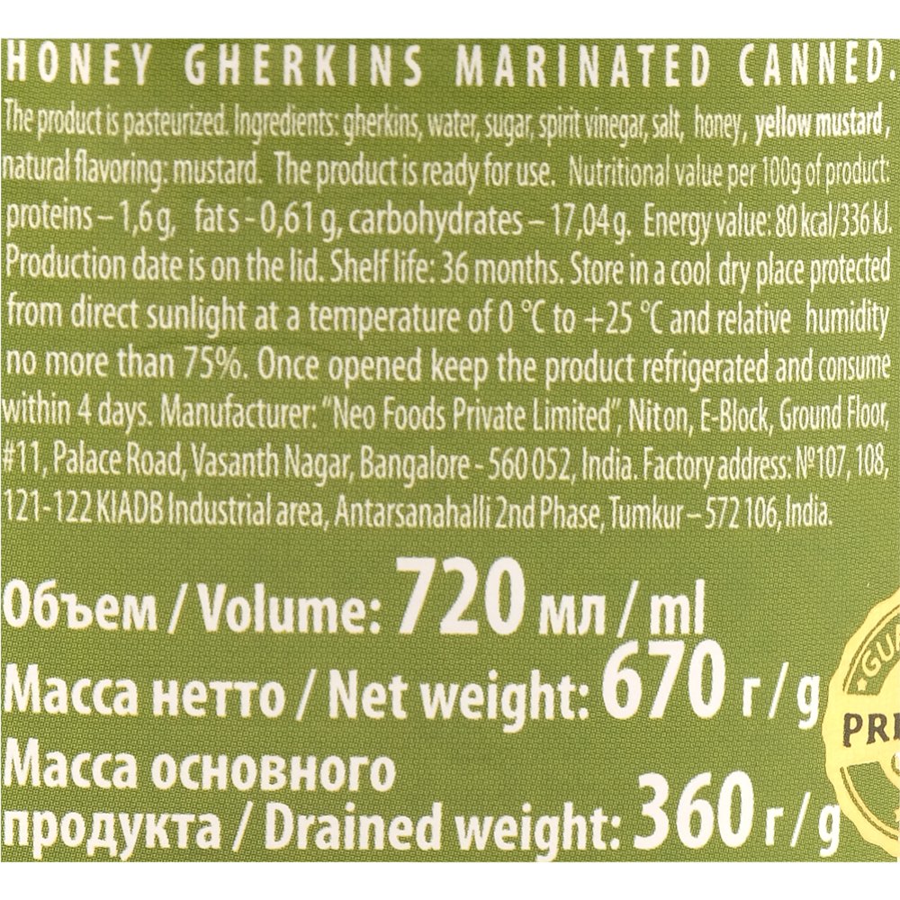 | Состав | Корнишоны, вода питьевая, сахар, уксус спиртовой, соль, мёд, укроп, лук, горчица жёлтая, перец черный, ароматизатор: пиросульфат калия. |