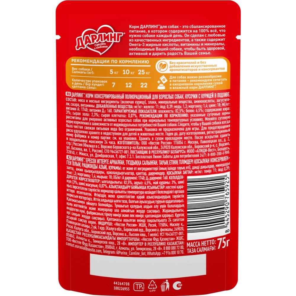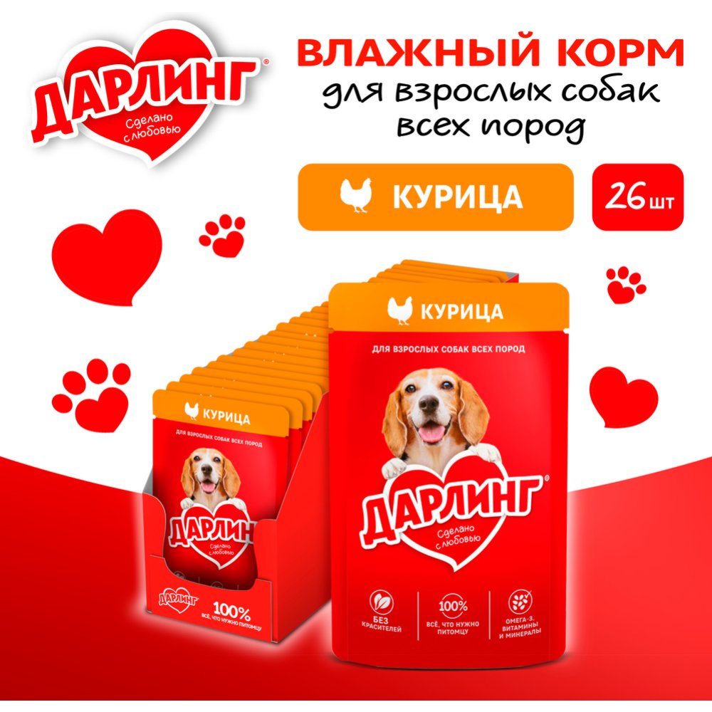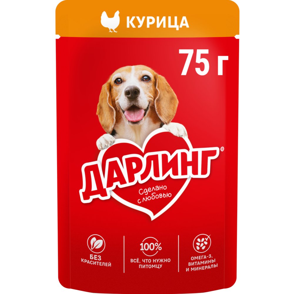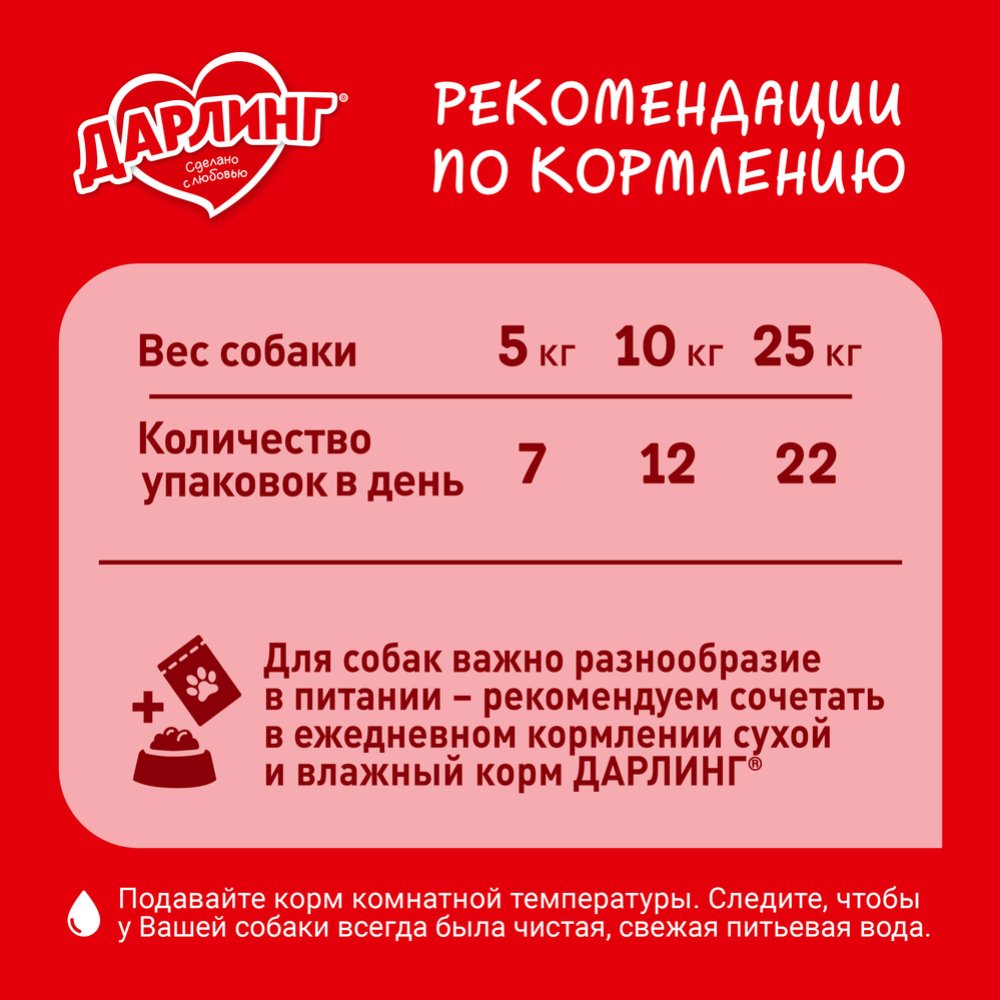 | Краткое описание | "Корм ДАРЛИНГ для собак – это сбалансированное питание, в котором содержится на 100% всё, что нужно собаке каждый день. Он сделан с любовью из качественных ингредиентов, а также содержит Омега-3 жирные кислоты, витамины и минералы, необходимые Вашей собаке, чтобы быть здоровой, активной и дарить радость Вашей семье. Без красителей и без добавления искусственных ароматизаторов и консервантов. Для собак важно разнообразие в питании – рекомендуем сочетать в ежедневном кормлении сухой и влажный корм ДАРЛИНГ." |