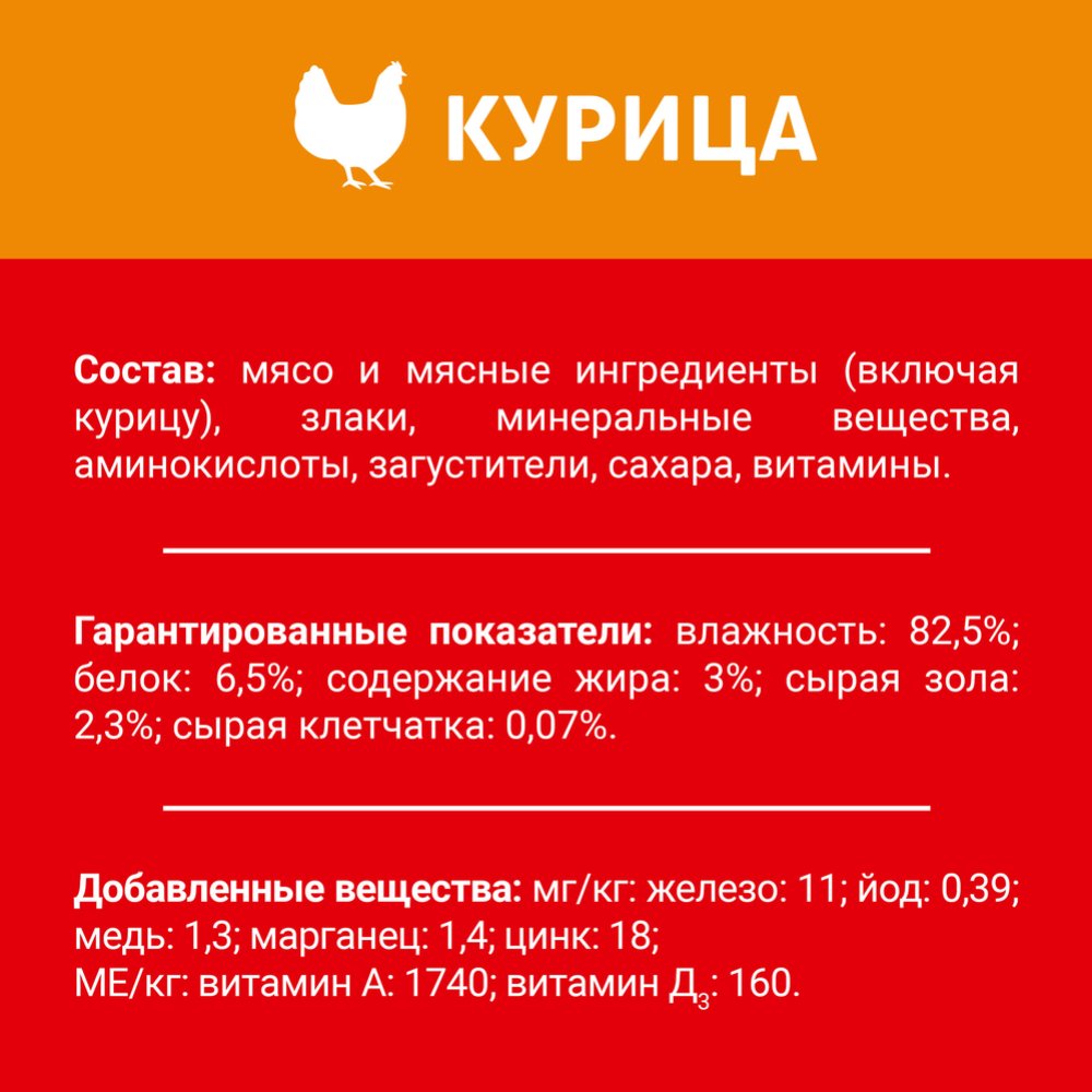 | Состав | мясо и мясные ингредиенты (включая курицу), злаки, минеральные вещества, аминокислоты, загустители, сахара, витамины. |
