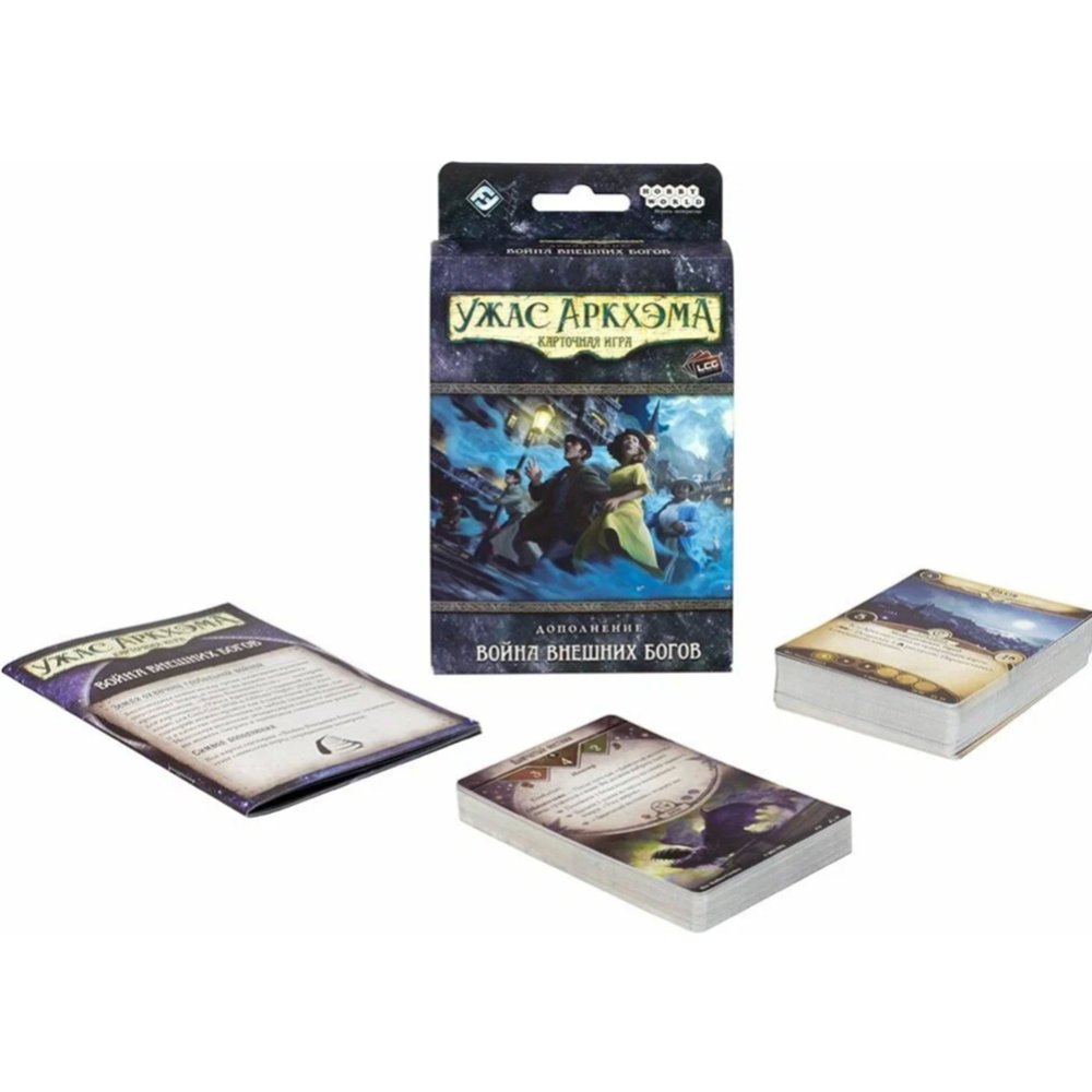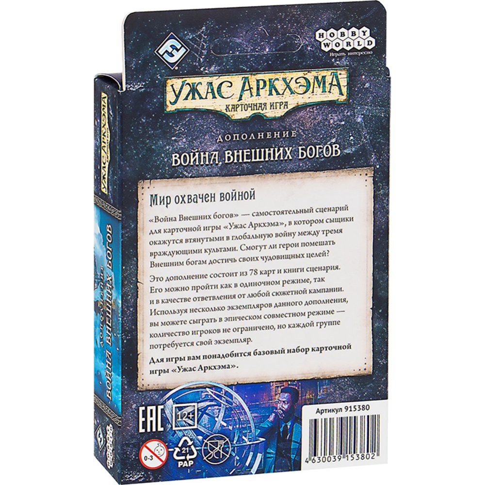 | Краткое описание | «Война Внешних богов» – самостоятельный сценарий для карточной игры «Ужас Аркхэма», в котором сыщики окажутся втянутыми в глобальную войну между тремя враждующими культами. Смогут ли герои помешать Внешним богам достичь своих чудовищных целей? Это дополнение состоит из 78 карт и книги сценария. Его можно пройти как в одиночном режиме, так и в качестве ответвления от любой сюжетной кампании. Используя несколько экземпляров данного дополнения, вы можете сыграть в эпическом совместном режиме – количество игроков не ограничено, но каждой группе потребуется свой экземпляр. Внимание! Это дополнение. Для игры вам понадобится базовая версия «Ужас Аркхэма. Карточная игра». Комплектация: -78 карт; -Книга сценария. |