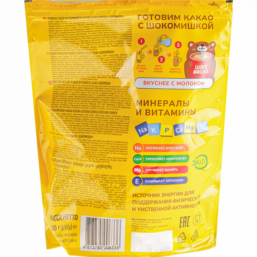 | Состав | сахар, сыворотка молочная сухая, какао-порошок алкализованный, какао-порошок натуральный, ароматизатор "Шоколад", соль йодированная (соль йодат калия, агент антислеживающий Е536). Напиток содержит природные минералы: К, Са, Mg, Р и витамины РР, Е. |