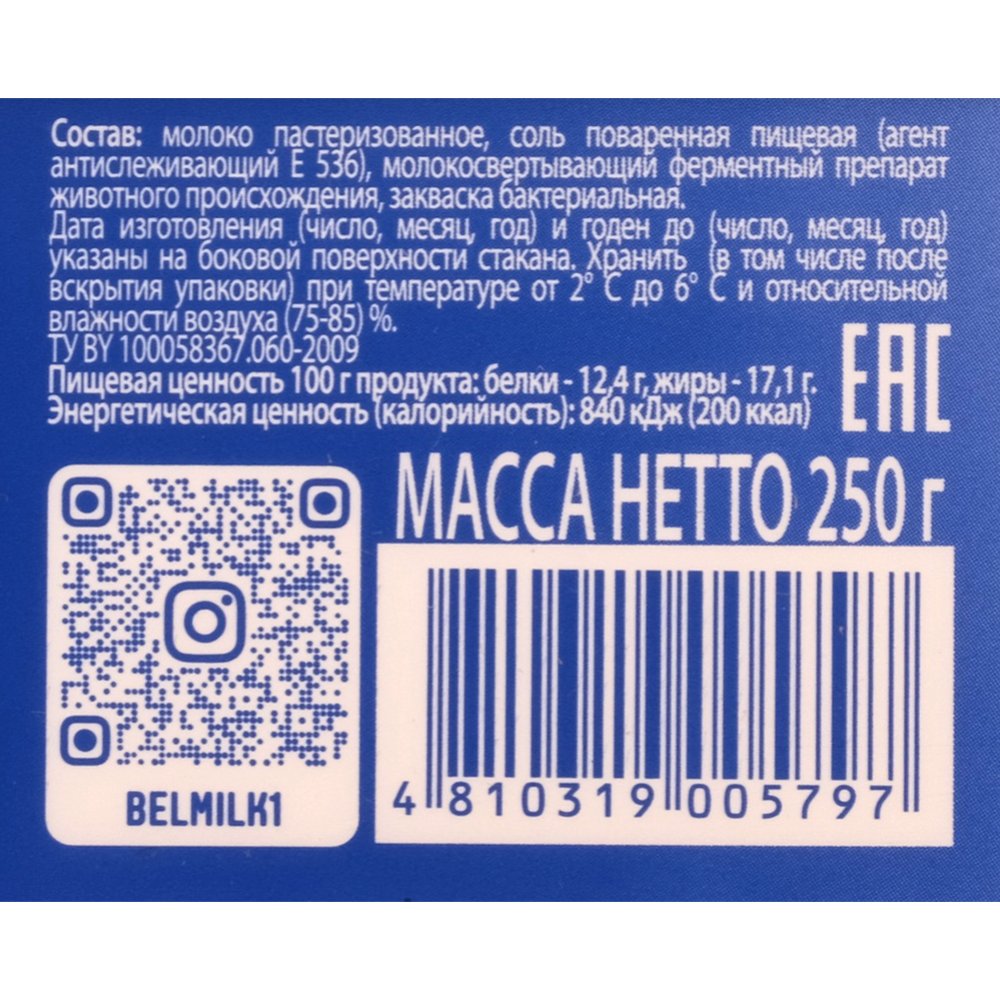 | Состав | молоко нормализованное, закваска бактериальная, натуральный жидкий сычужный фермент Naturen Premium 225, соль поваренная пищева (противослеживающая добавка Е 536). |