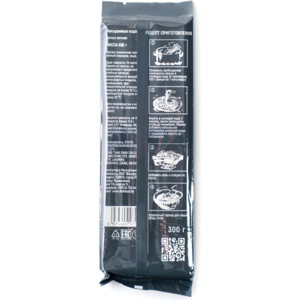 | Краткое описание | Яичная лапша - для приготовления, понятно по названию, используются яйца, и цвет лапши может быть светлее или темнее, в зависимости от того какая часть яйца используется при приготовлении (белок или желток). Приятный и насыщенный вкус, один из самых популярных видов китайской лапши. |