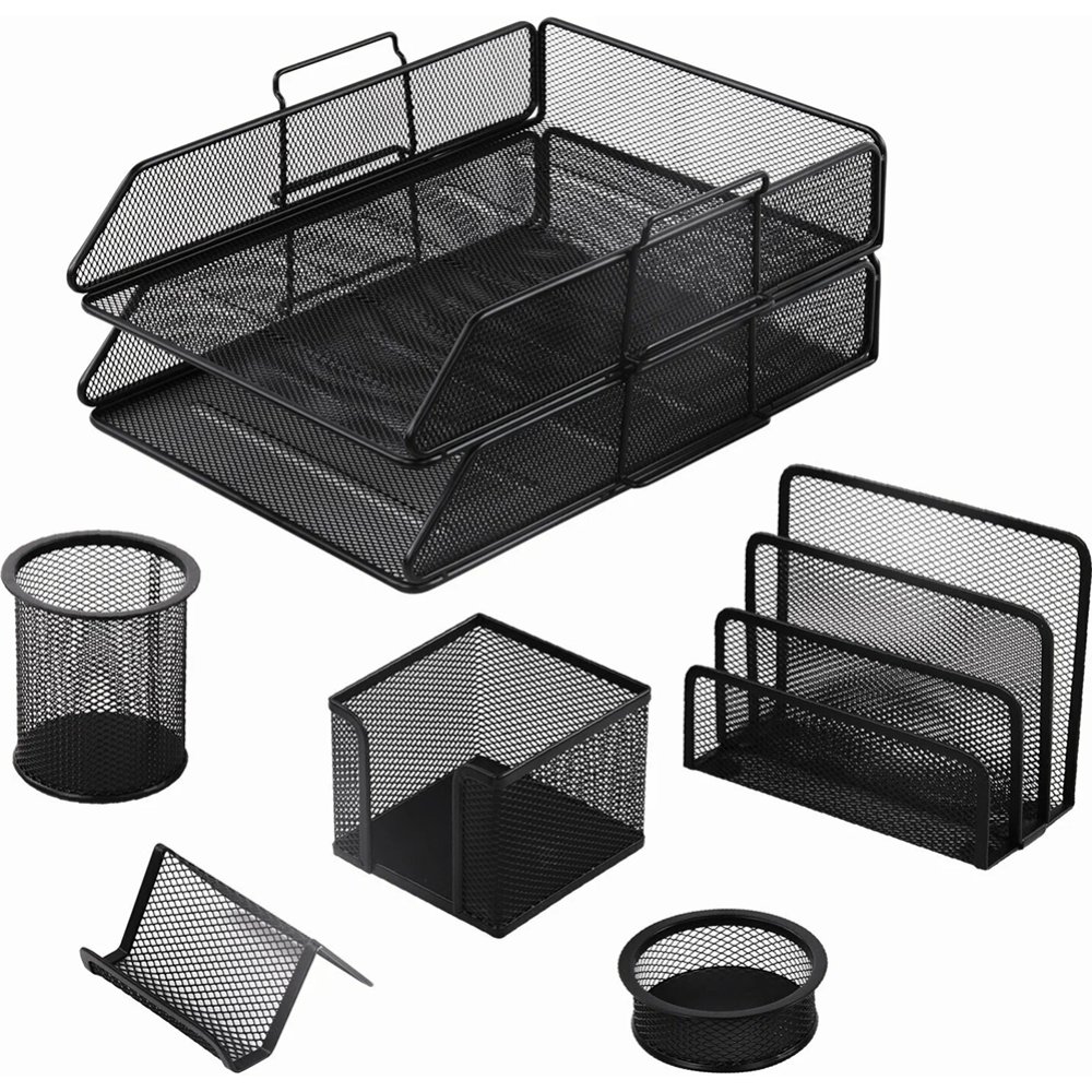 | Краткое описание | В комплект набора входят 7 предметов: 2 поддона для бумаг формата А4; трехсекционная подставка для бумаг и писем; подставка для бумажного блока размером 100х100 мм; подставка-органайзер для канцелярских мелочей; подставка-органайзер для пишущих принадлежностей; подставка для визиток. |