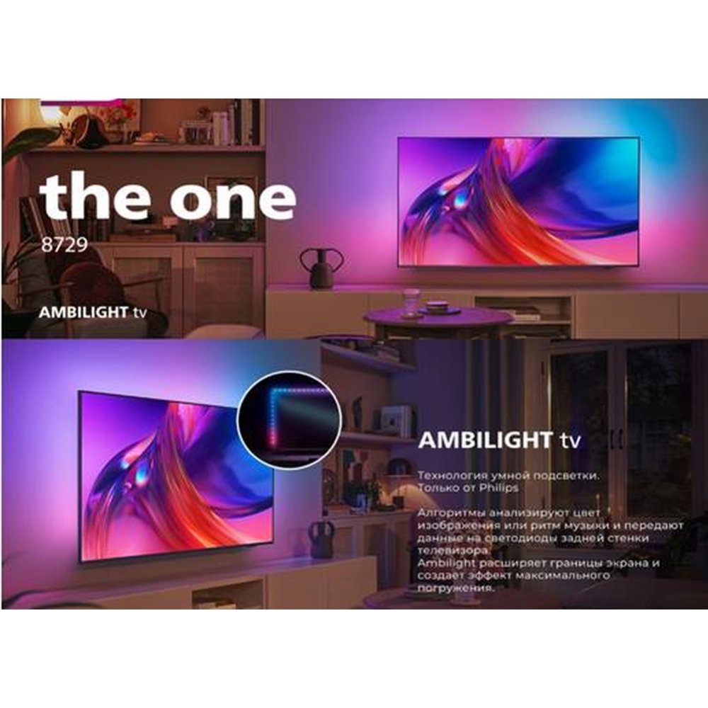 | Краткое описание | Телевизор с Ambilight и эффектом погружения. The One с превосходным изображением. Процессор Philips P5. The One с Dolby Vision и Dolby Atmos. Сверхчеткая картинка. Яркие впечатления от просмотра. Тонкий телевизор. Функции будущего. Беспроводная домашняя аудиосистема Philips с DTS Play-Fi Время играть! 120 Гц, VRR, FreeSync и минимальная задержка ввода. Ваши любимые развлечения с небольшой помощью Google. Голосовое управление. Google Ассистент. Работает с Alexa |