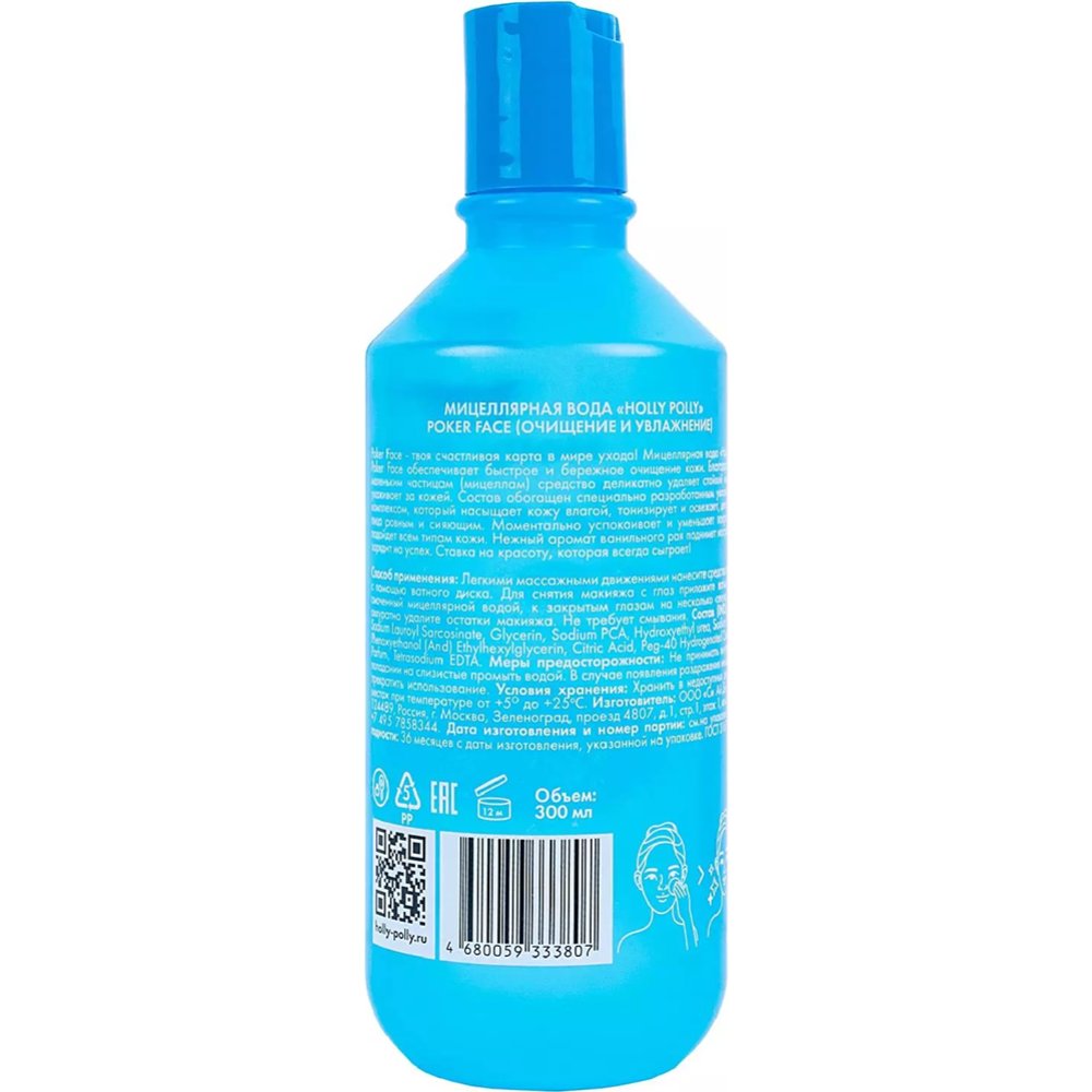 | Краткое описание | Мицеллярная вода Holly Polly Poker Face обеспечивает быстрое и бережное очищение кожи. Благодаря очень маленьким частицам (мицеллам) средство деликатно удаляет стойкий макияж и ухаживает за кожей. Состав обогащен специально разработанным увлажняющим комплексом, который насыщает кожу влагой, тонизирует и освежает, делает цвет лица ровным и сияющим. Моментально успокаивает и уменьшает покраснение, подойдет всем типам кожи. Нежный аромат ванильного рая поднимет настроение и зарядит на успех. Ставка на красоту, которая всегда сыграет! |