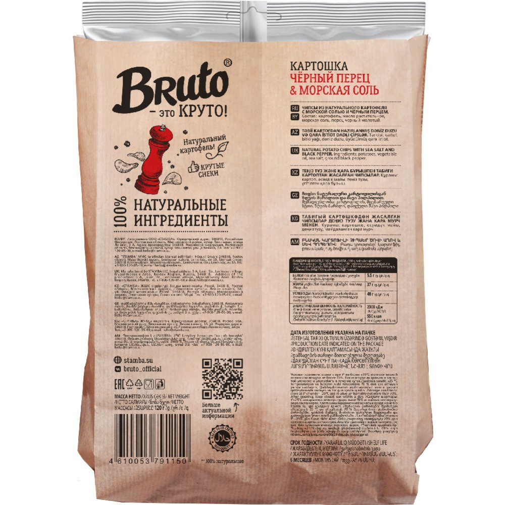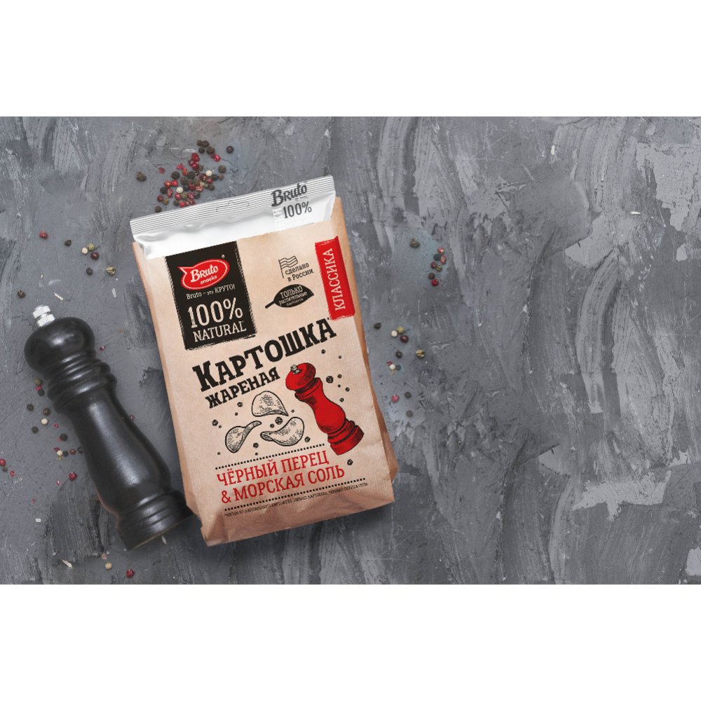| Краткое описание | Чипсы из натурального картофеля с морской солью и черным перцем Bruto - это хрустящие чипсы, изготовлены из натурального картофеля с ярким эксклюзивным вкусом. Двухслойная упаковка из крафт-бумаги обеспечивает целостность продукта. |