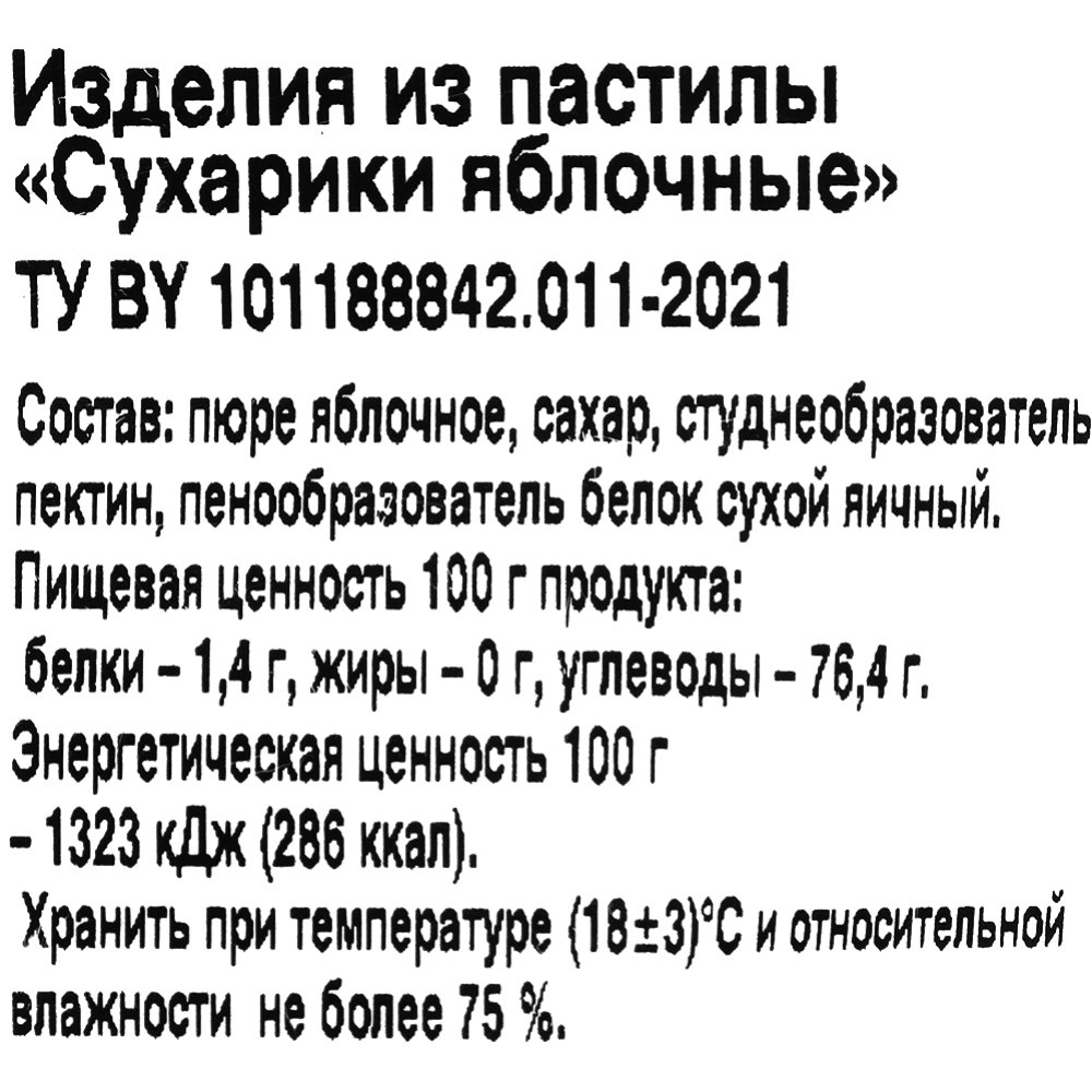 | Состав | пюре яблочное, сахар, студнеобразователь пектин, пенообразователь белок сухой яичный. |