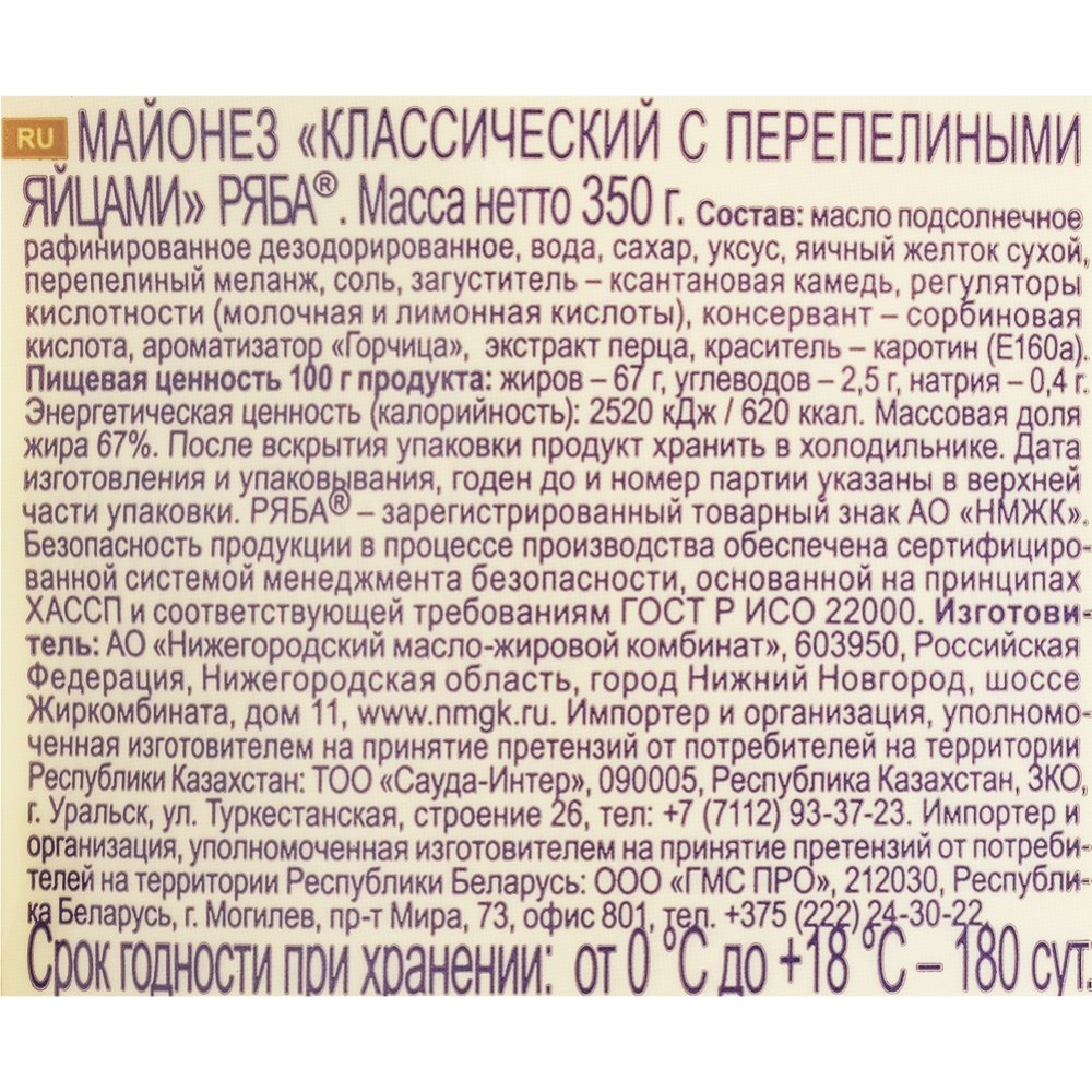 | Состав | масло подсолнечное рафинированное дезодорированное, вода, сахар, уксус, яичный желток сухой, перепелиный меланж, соль, загуститель - ксантовая камедь, регуляторы кислотности (молочная и лимонная кислоты), консервант - сорбиновая кислота, ароматизатор «Горчица», экстракт перца, краситель - каротин (Е160а). |