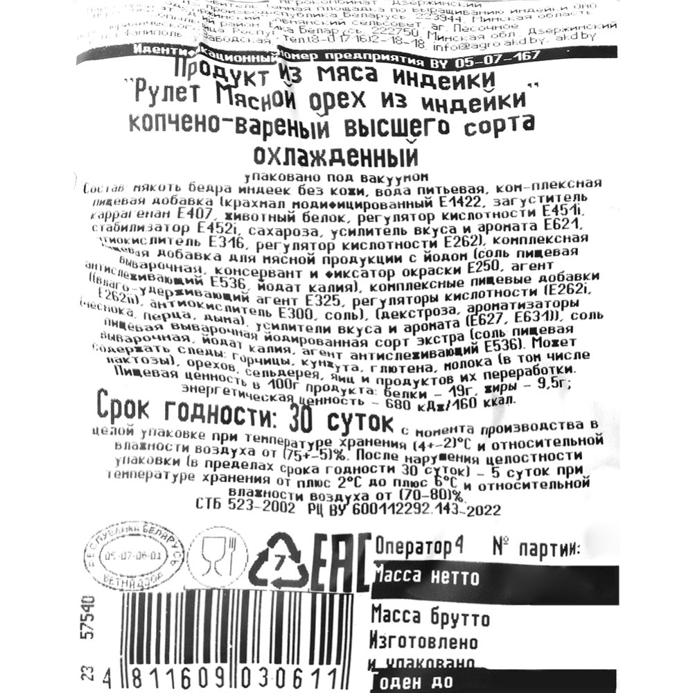 | Состав | мякоть бедра индеек без кожи, вода питьевая, комплексная пищевая добавка (крахмал модифицированный Е1422, загуститель каррагинан Е407, животный белок, регулятор кислотности Е451i, стабилизатор Е452i, сахароза, усилитель вкуса и аромата Е621, антиокислитель Е316, регулятор кислотности Е262), комплексная пищевая добавка для мясной продукции с йодом (соль пищевая выварочная, консервант и фиксатор окраски Е250, агент антислеживающий Е536, йодат калия), комплексные пищевые добавки ((влагоудерживающий агент Е325, регуляторы кислотности (Е262i, Е262ii), антиокислитель Е316, соль), (декстроза, ароматизаторы (чеснока, перца, дыма), усилители вкуса и аромата (Е627, Е631)), соль пищевая выварочная йодированная сорт экстра (соль пищевая выварочная, йодат калия, агент антислеживающий Е536). Может содержать следы: горчицы, кунжута, глютена, молока (в том числе лактозы), орехов, сельдерея, яиц и продуктов их переработки. |