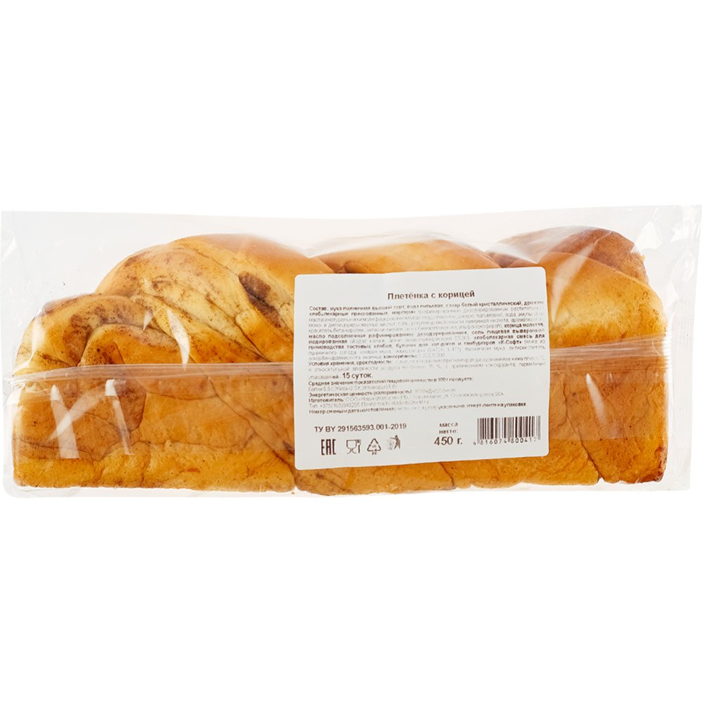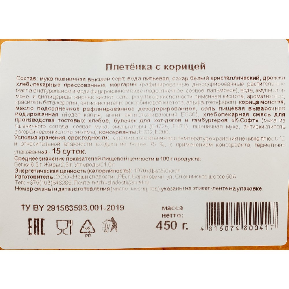 | Состав | мука пшеничная высший сорт, вода питьевая, сахар белый кристаллический, дрожжи хлебопекарные прессованные, маргарин (рафинированные дезодорированные растительные масла в натуральном и модифицированном виде (подсолнечное, соевое, пальмовое), вода, эмульгатор моно- и диглицериды жирных кислот, соль, регулятор кислотности лимонная кислота, ароматизатор, краситель, бета-каротин, антиокислители: аскорбиновая кислота, альфа-токоферол), корица молотая, масло подсолнечное рафинированное дезодорированное, соль пищевая выварочная йодированная (йодат калия, агент антислеживающий Е536), хлебопекарная смесь для производства тостовых хлебов, булочек для хот-догов и гамбургеров «К-Софт» (мука из пшеничного солода, соевая мука, эмульгаторы (Е472е, Е471), пшеничная мука, антиокислитель аскорбиновая кислота, энзимы), консерванты: Е282, Е200. |