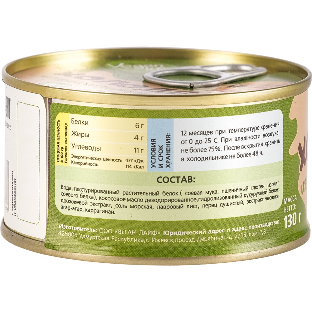 | Состав | вода, текстурированный растительный белок (соевая мука, пшеничный глютен, изолят соевого белка), кокосовое масло дезодорированное, гидролизованный кукурузный белок, дрожжевой экстракт, соль морская, лавровый лист, перец душистый, экстракт чеснока, агар-агар, каррагинан. |