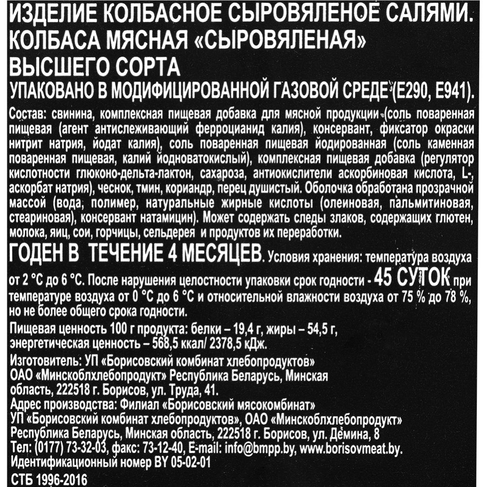 | Производитель | ОАО «Борисовский мясокомбинат №1» Минская область, г. Борисов, ул. Демина, 8, Республика Беларусь. |