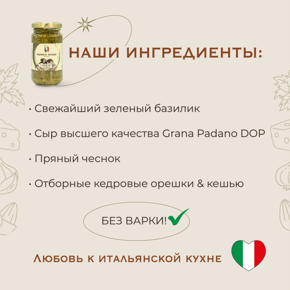 | Состав | базилик в подсолнечном масле (базилик D.O.P. 29%, масло подсолнечное, соль, антиоксидант: аскорбиновая кислота (E300)), кешью, масло подсолнечное, сыр Grana Padano DOP (молоко, соль, сычужный фермент, яичный лизоцим), регулятор кислотности: молочная кислота (E270), кедровые орехи, чесночный порошок, краситель пищевой: хлорофилл. Может содержать следы орехов, сои, арахиса. |