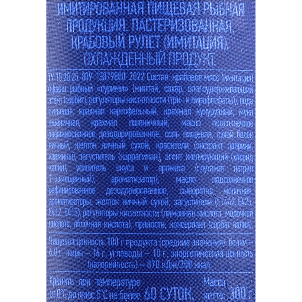 | Состав | крабовое мясо (имитация) ((фарш рыбный «сурими» (минтай, сахар, влагоудерживающий агент (сорбит), регуляторы кислотности (три- и пирофосфаты)), вода питьевая, крахмал картофельный, крахмал кукурузный, мука пшеничная, крахмал пшеничный, масло подсолнечное рафинированное дезодорированное, соль пищевая, сухой белок яичный, желток яичный сухой, красители (экстракт паприки, кармины), загуститель (каррагинан), агент желирующий (хлорид калия), усилитель вкуса и аромата (глутамат натрия 1-замещенный), ароматизатор), масло подсолнечное рафинированное дезодорированное, сыворотка молочная, ароматизаторы, желток яичный сухой, загустители (Е1442, Е425, Е412, Е415), регуляторы кислотности (уксусная кислота, молочная кислота), пряности, консервант (сорбат калия). |