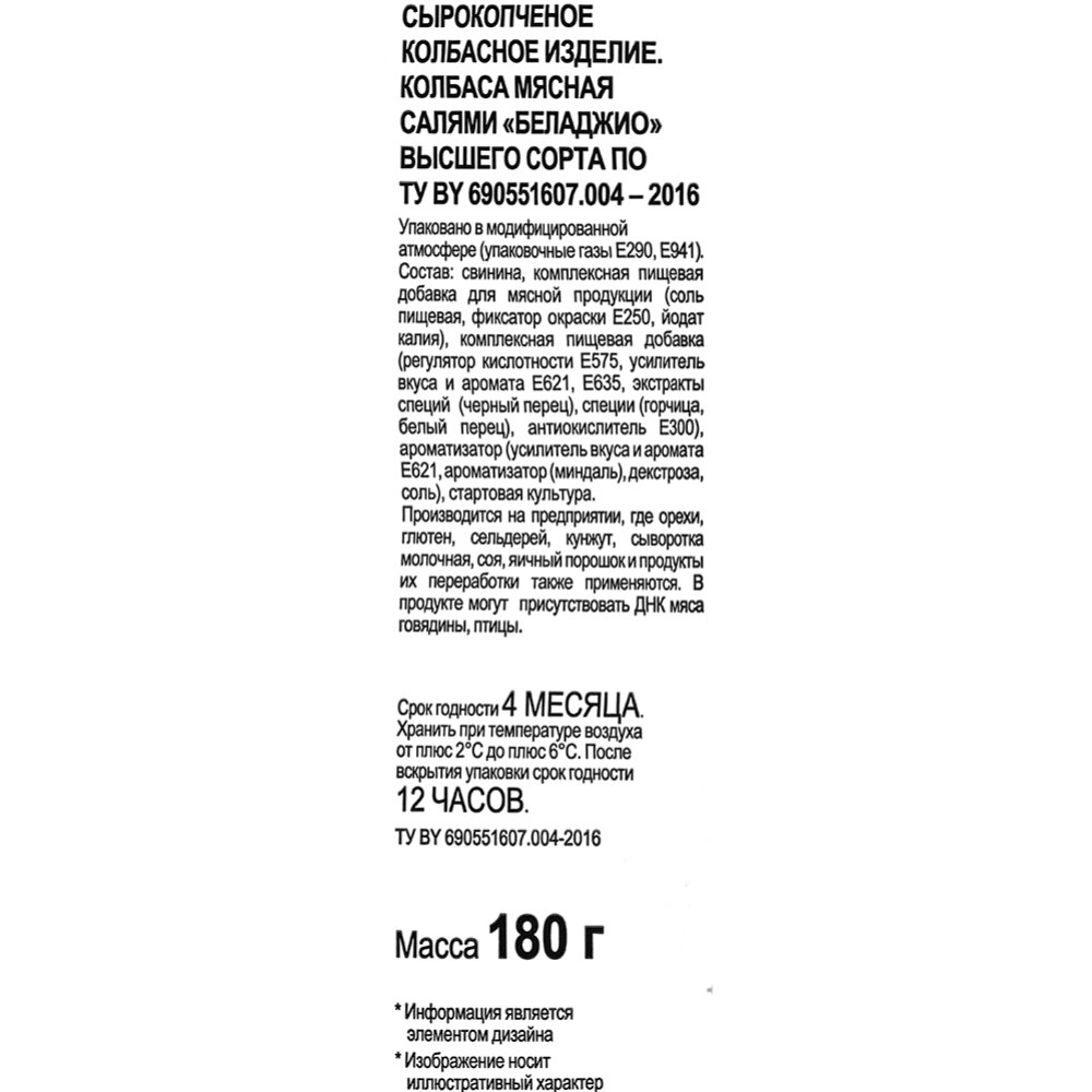 | Краткое описание | Отличительной особенностью колбасы «БЕЛАДЖИО» является приятный аромат миндаля и запоминающийся вкус. Каждый кусочек нашей салями «БЕЛАДЖИО» — это результат тщательного отбора ингредиентов и соблюдения высоких стандартов качества. Специально подобранные специи и добавки создают гармоничное сочетание, которое порадует даже самых взыскательных гурманов. Удобный вес в 180 грамм делает её идеальным вариантом для создания бутербродов, закусок и для сервировки на праздничном столе. |