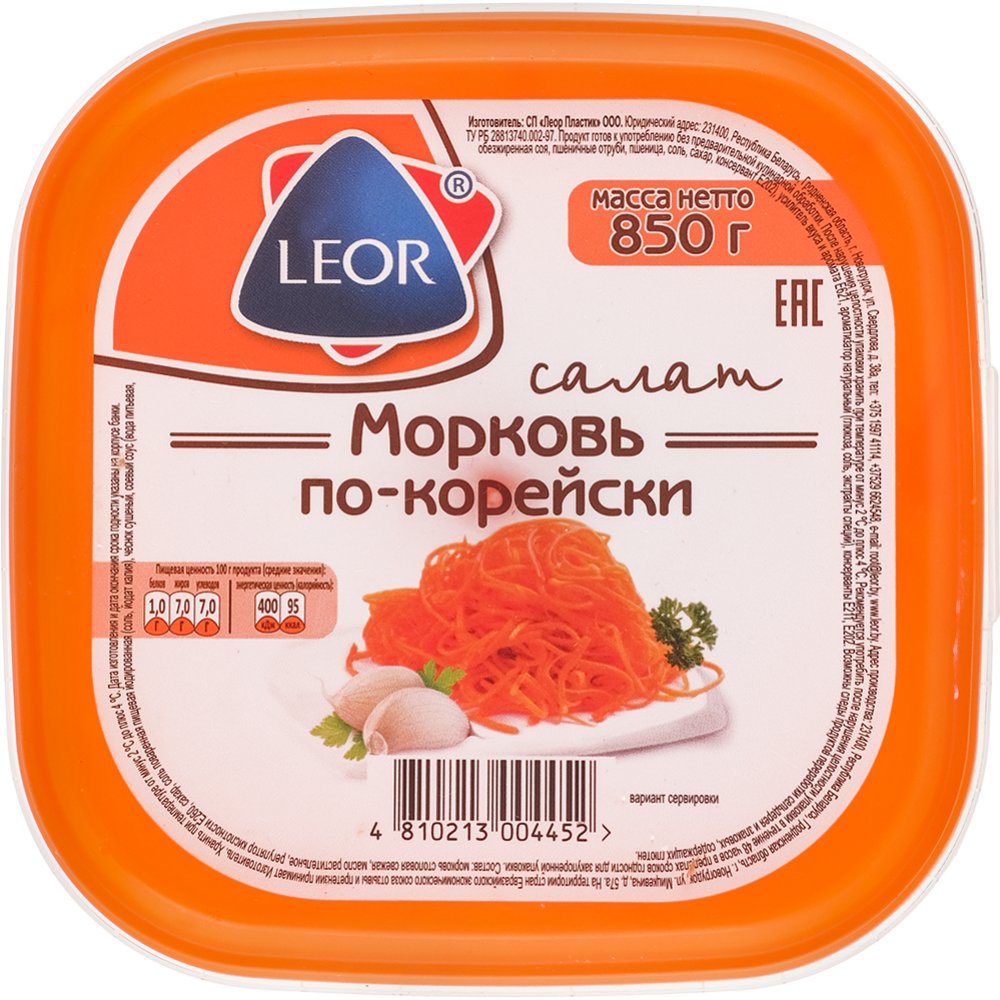 | Состав | Морковь столовая свежая, масло подсолнечное, сахар, чеснок сушеный, соль, усилитель вкуса и аромата - глутамат натрия, регулятор кислотности - кислота уксусная для пищевых целей, соевый соус, специи, консерванты - Е202, Е211. |