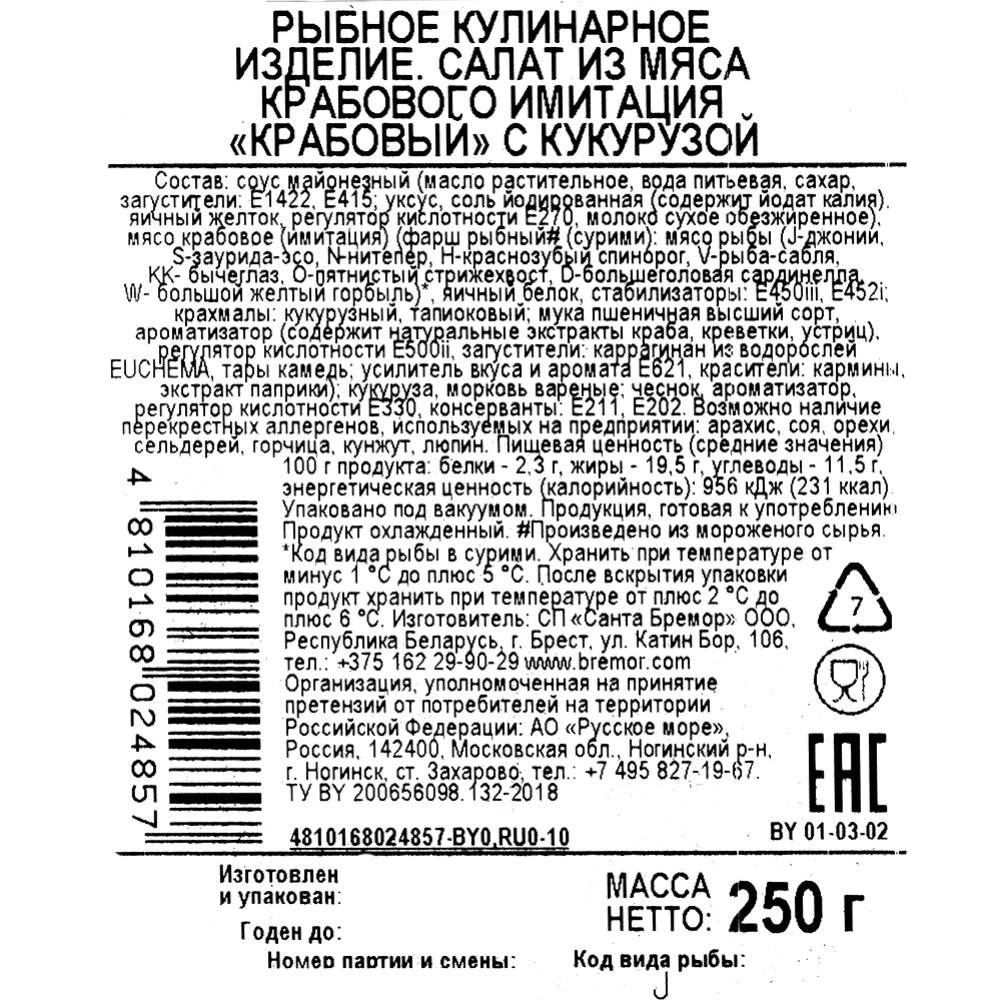 | Состав | соус майонезный (масло подсолнечное, вода, сахар, яичный желток, загустители: кукурузный крахмал, ксантановая камедь: регуляторы кислотности: уксусная и лимонная кислоты), мясо крабовое имитация (сурими (мясо рыбы, регуляторы кислотности: пирофосфат и трифосфат натрия), крахмалы: кукурузный, тапиоковый; мука пшеничная, ароматизатор, яичный белок, регуляторы кислотности: карбонат натрия, молочная кислота; загуститель Е401, стабилизатор Е452, усилитель вкуса и аромата глутамат натрия, красители: кармин, экстракт паприки), кукуруза, морковь консервированные, соль, чеснок, консерванты: бензоат натрия, сорбат калия. |
