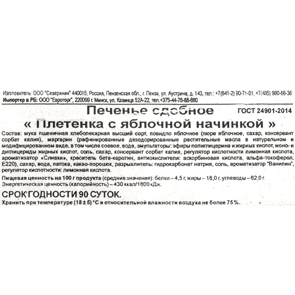 | Состав | мука пшеничная хлебопекарная высшего сорта, консервант: сорбиновая кислота, маргарин (рафинированные дезодорированные растительные масла: подсолнечное, пальмовое, пальмоядровое вода, эмульгаторы Е471, Е322, соль, сахар, консервант- сорбат калия, регулятор кислотности - лимонная кислота, ароматизатор, краситель бета - каротин, антиокислители Е300, Е307, E220), сахар, вода, патока крахмальная, какао-порошок, яблочная начинка (повидло со вкусом вишни - пюре яблочное, сахар, патока кукурузная, регулятор кислотности - лимонная кислота, краситель пищевой натуральный «Кармин 0030» разрыхлители: натрий двууглекилый, соль поваренная пищевая, ароматизатор «Ванилин» «Вишня» регулятор кислотности: лимонная кислота. |
