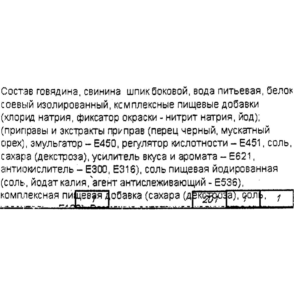 | Состав | говядина, свинина, шпик боковой, вода питьевая, белок соевый изолированный, комплексные пищевые добавки: (хлорид натрия, фиксатор окраски - нитрит натрия, йод); (приправы и экстракты приправ (перец черный, мускатный орех), эмульгатор – Е450, регулятор кислотности – Е451, соль, сахара (декстроза), усилитель вкуса и аромата – Е621, антиокислитель – Е300, Е316), соль пищевая йодированная (соль, йодат калия, агент антислеживающий - Е536), комплексная пищевая добавка (сахара (декстроза), соль, краситель – Е120). Возможно остаточное количество муки пшеничной, горчицы, мускатного ореха, крупы перловой. |