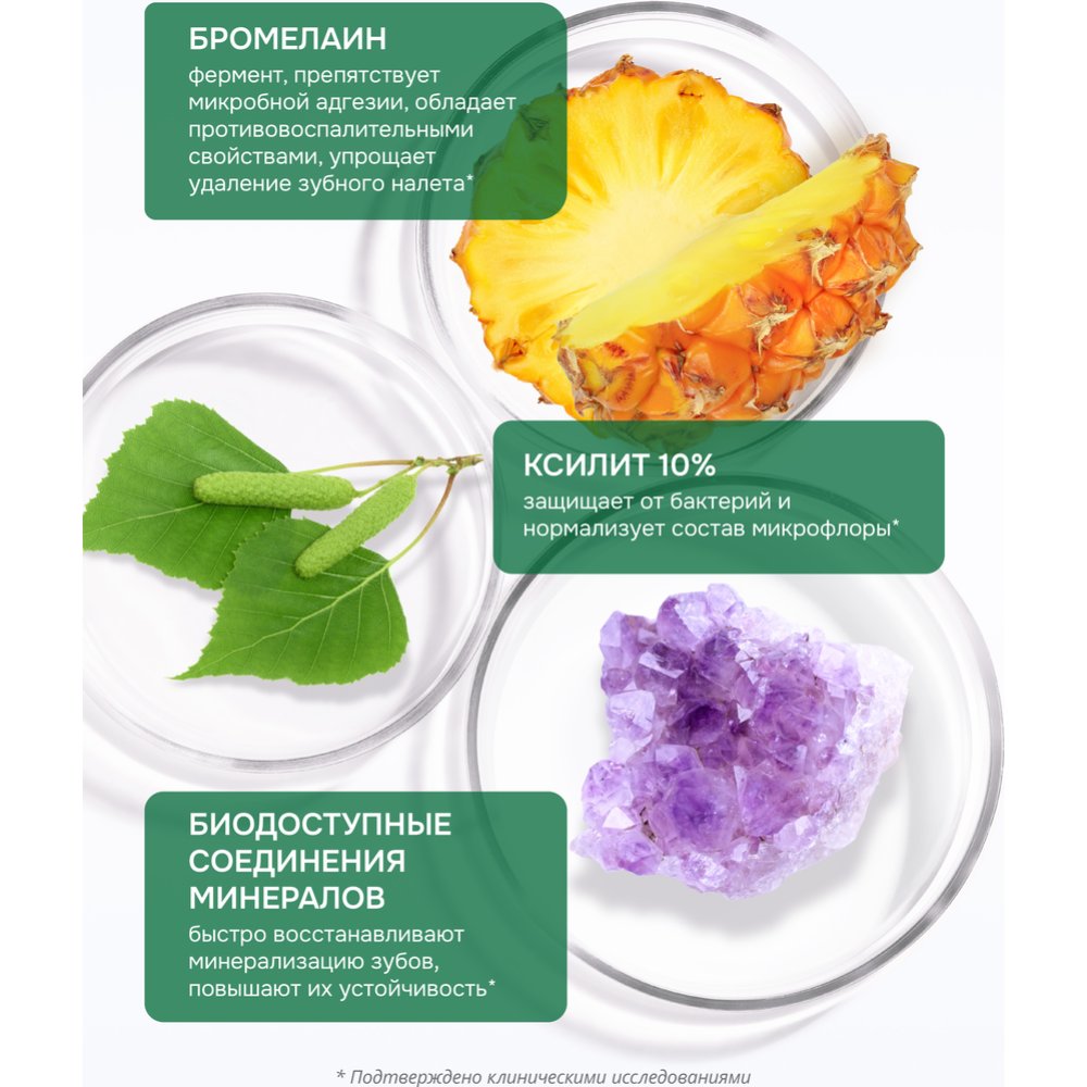 | Состав | aqua, silica, glycerin, xylitol, sodium lauryl sulfate, xanthan gum, aroma, calcium glycerophosphate, bromelain, sodium saccharine, methylparaben, titanium dioxide, propylparaben, magnesium chloride, limonene. |
