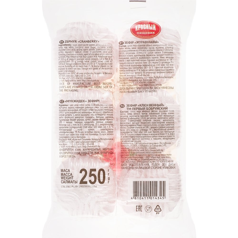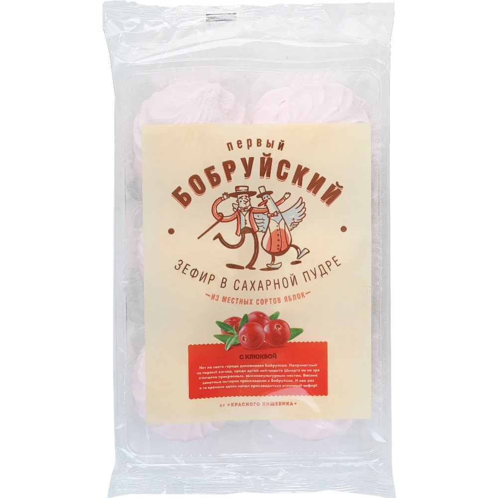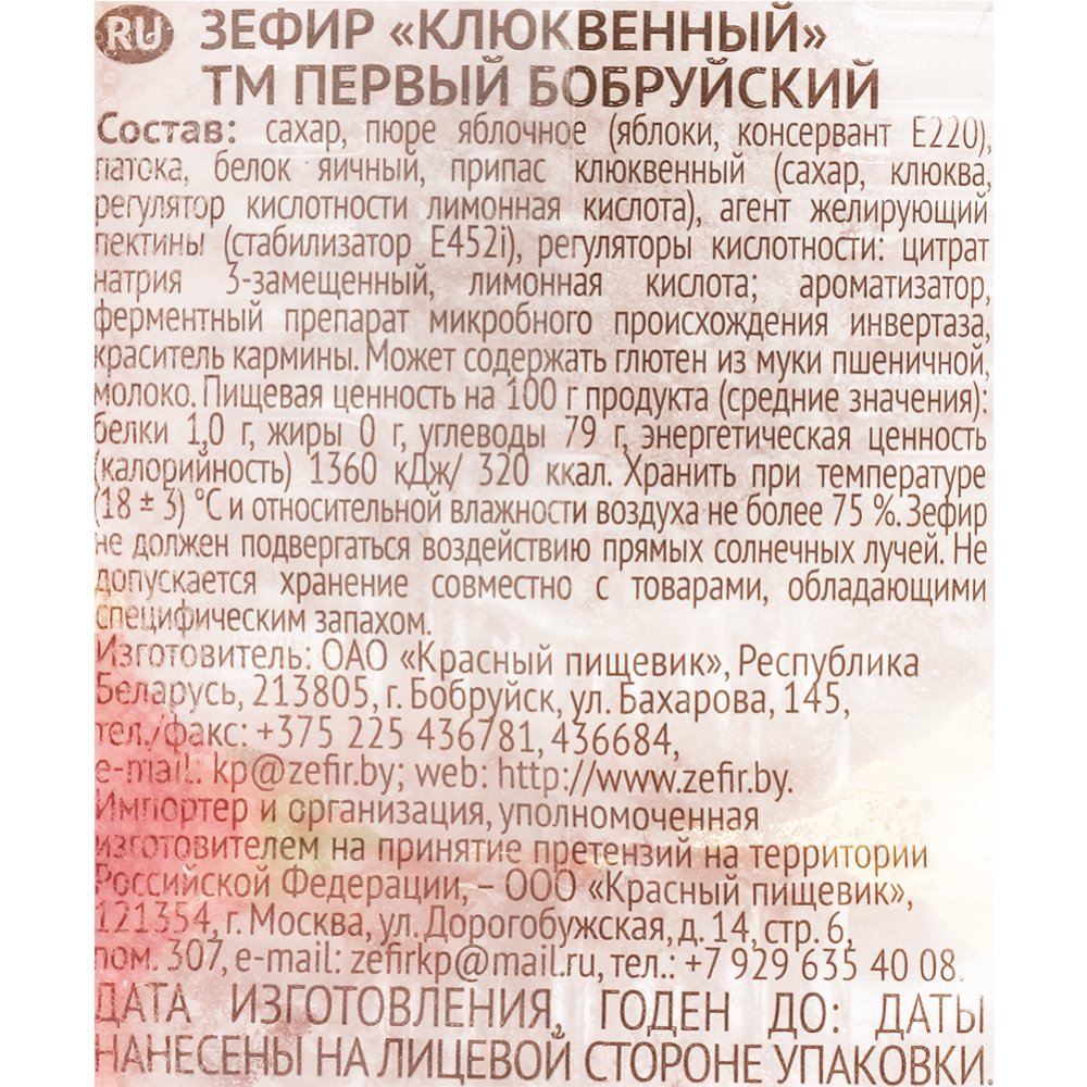 | Состав | сахар, пюре яблочное (яблоки, консервант Е220), патока, белок яичный, припас клюквенный (сахар, клюква, регулятор кислотности: кислота лимонная), желирующий агент пектин цитрусовый (стабилизатор Е452i), регуляторы кислотности: цитрат натрия,(регуляторы кислотности: натрий двууглекислый, кислота лимонная), кислота лимонная, ароматизатор клюква, технологическое вспомогательное средство ферментный препарат инвертаза «Биоинверт-200». Может содержать муку пшеничную. |
