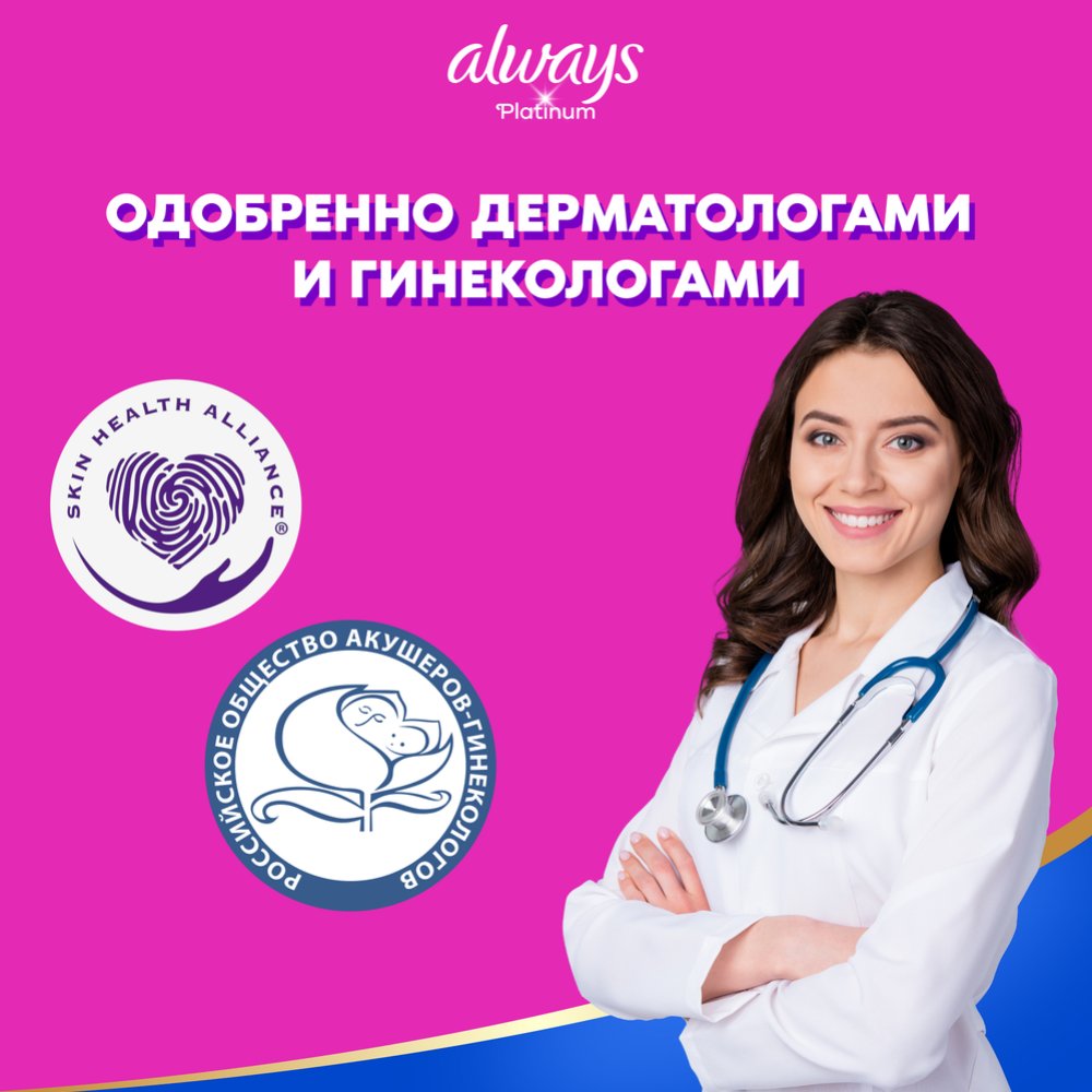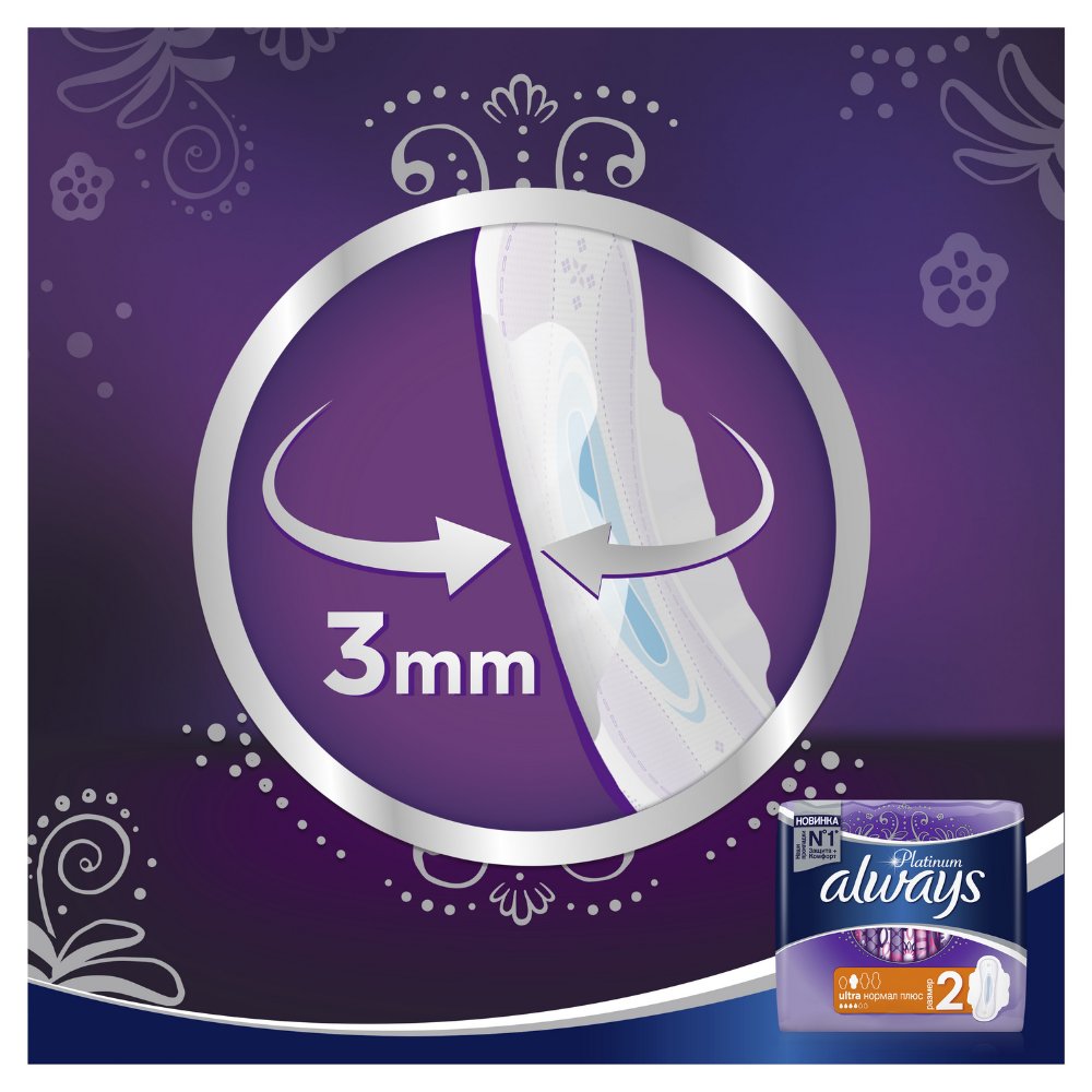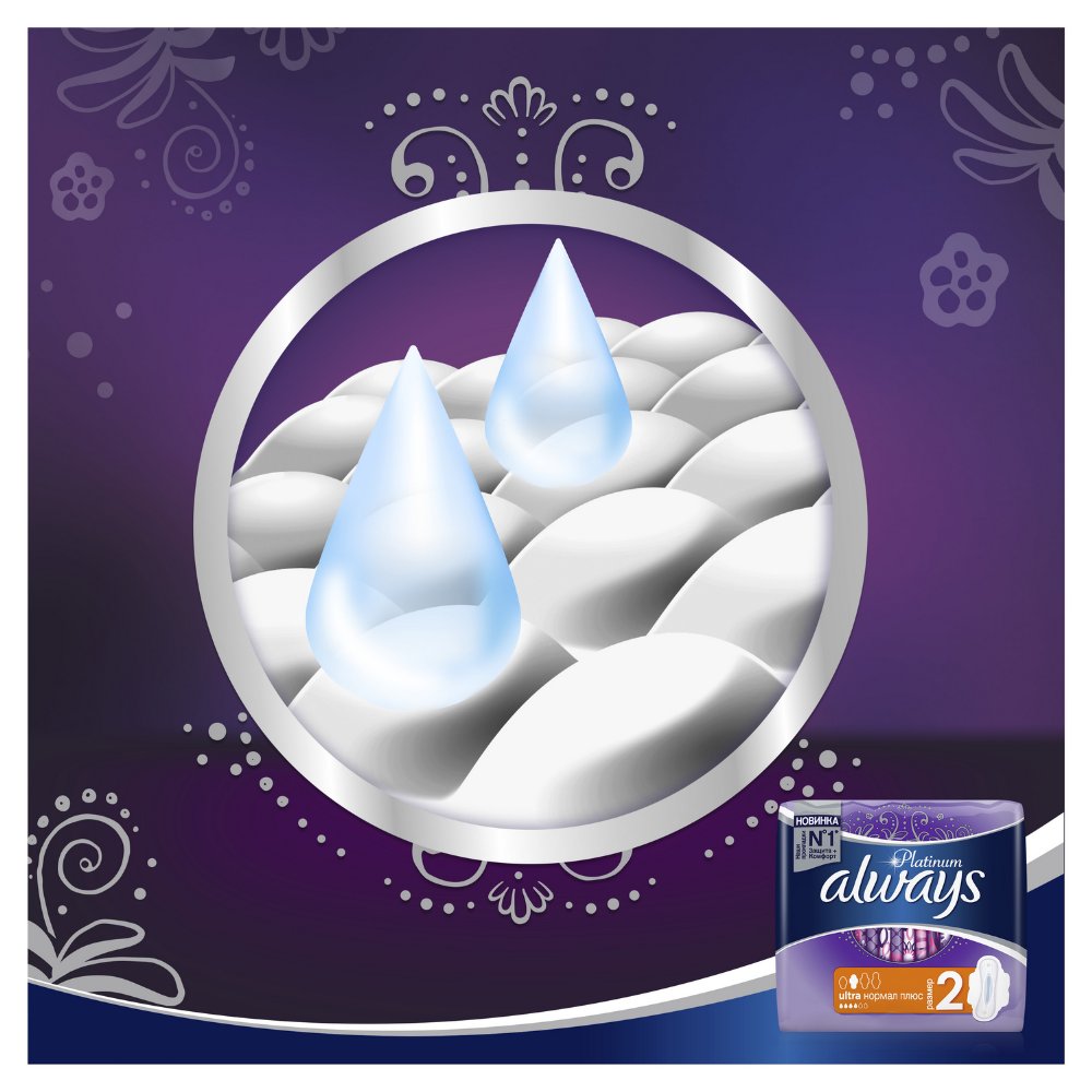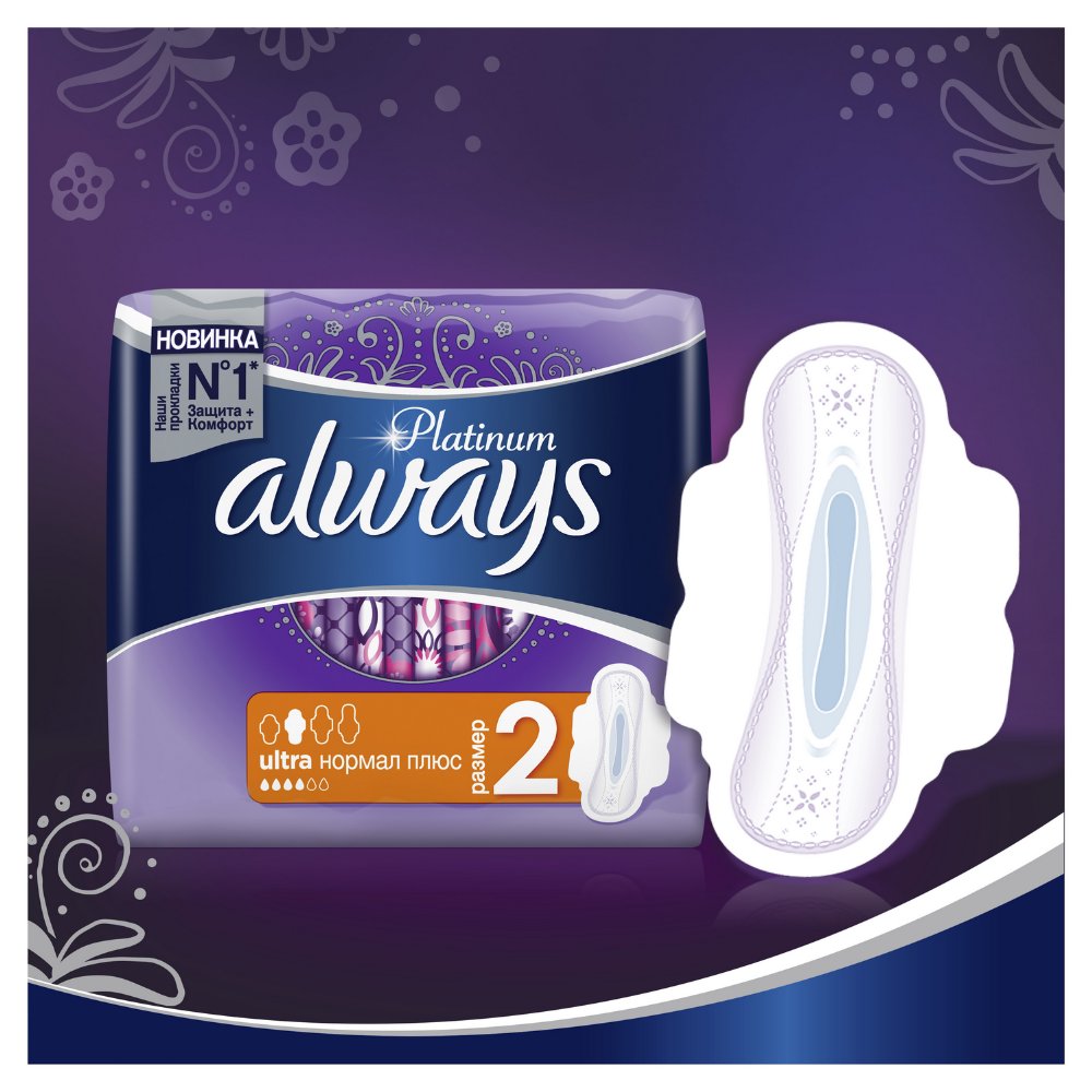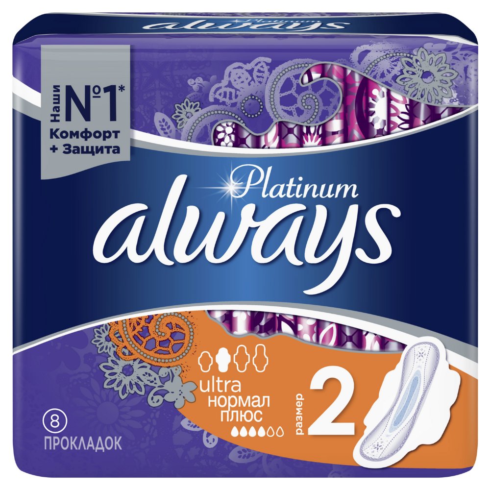 | Краткое описание | Гигиенические прокладки Always Platinum обеспечивают лучшее сочетание комфорта и защиты среди прокладок Always. Always Platinum более комфортны (по сравнению с Always Ultra) благодаря тысячам микроподушечек и новым, мягким как шелк крылышкам. Они также обеспечивают лучшую защиту (по сравнению с Always Ultra) благодаря защитным боковым барьерам и ультравпитывающему внутреннему слою, который запирает влагу внутри. Always Platinum Нормал Плюс (Размер 2) с крылышками рекомендованы для дневного использования при скудных и умеренных выделениях. Попробуйте Always Platinum Ночные (Размер 4) — лучшие гигиенические прокладки в линейке Always Platinum для защиты в ночное время. Лучшие комфорт и защита (в линейке Always Ultra)1000-чи мягких микроподушечек. Мягкие как шелк крылышки. Защитные боковые барьеры. Нейтрализуют неприятные запахи. Ультравпитывающий внутренний слой. Гигиенические прокладки не раздражают кожу (доказано дерматологами). |