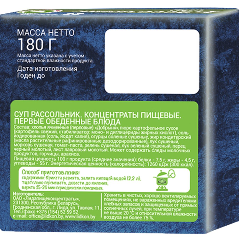 | Состав | хлопья ячменные (перловые) «Добрыня», пюре картофельное сухое (картофель свежий, стабилизхатор: моно- и диглицериды жирных кислот), соль йодированная (соль, йодат калия), огурцы соленые сушеные, жир кондитерский (масла растительные рафинированные дезодированные, )лук сушеный, морковь сушеная, томат-паста, зелень сушеная, лук сушеный зеленый, перец черный молотый, лист лавровый молотый. Может содержать следы молочных продуктов, горчицы, арахиса. |