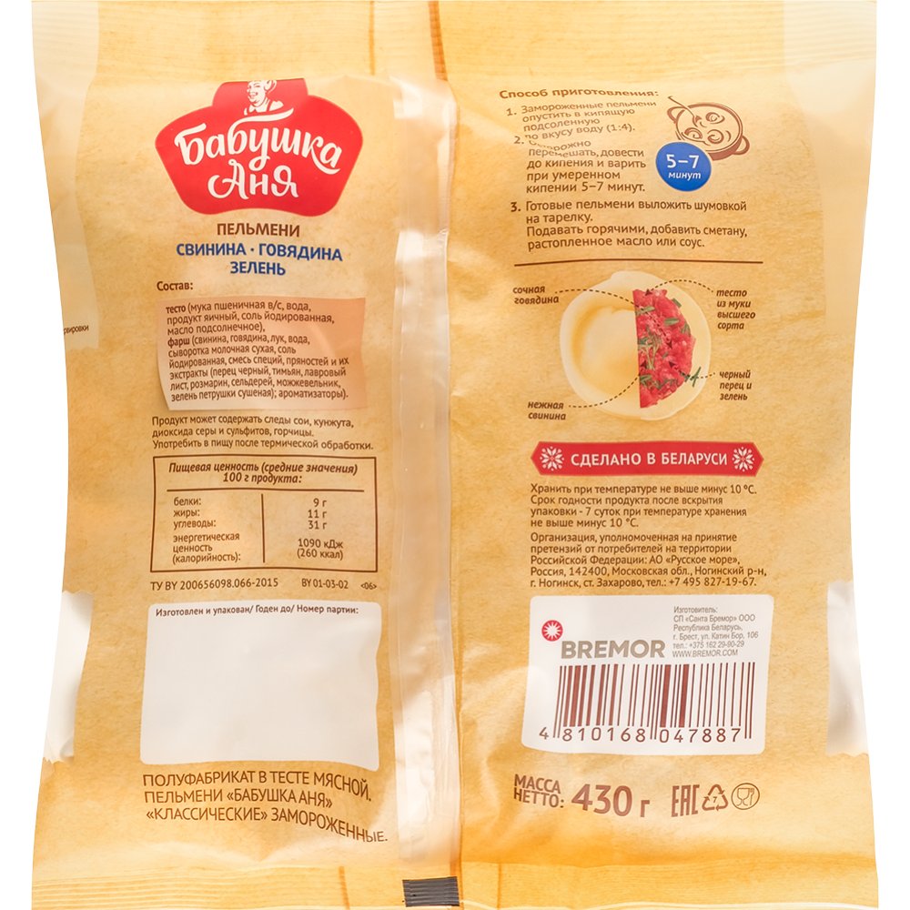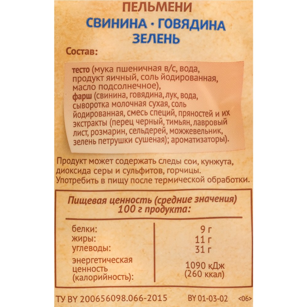 | Состав | мука пшеничная в/с, свинина, лук, говядина, соль йодированная пищевая, мука соевая, волокно натуральное пищевое, масло подсолнечное, зелень петрушки сушеная, кориандр, сахар, перец черный, усилитель вкуса глутамат натрия, вода. |