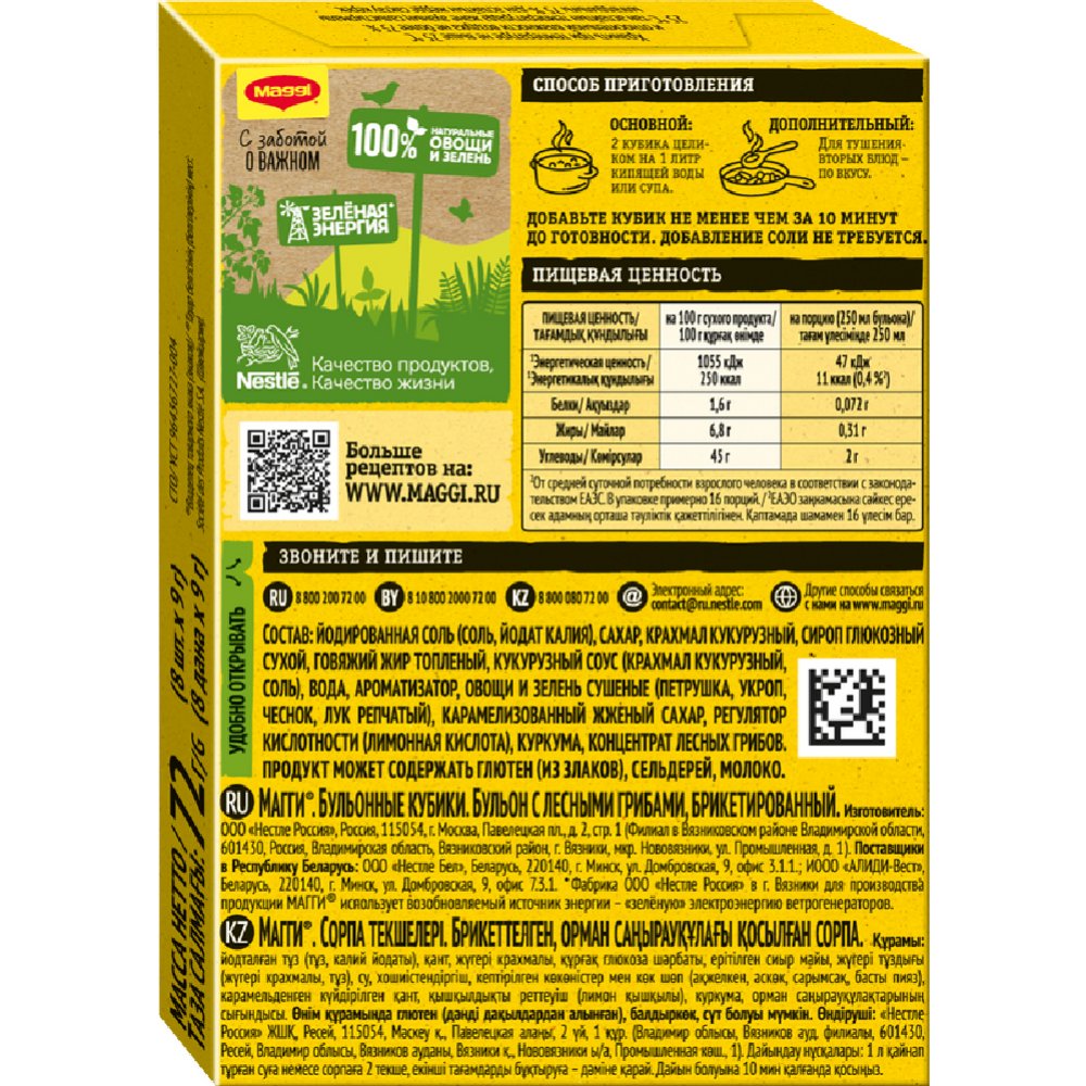| Краткое описание | В бульонном кубике MAGGI® идеально сбалансированы пряности, специи, соль и ароматные лесные грибы. А натуральные овощи и зелень придадут блюду аппетитный внешний вид. Идеальное дополнение к вашим любимым грибным блюдам. В составе кубиков MAGGI® теперь только знакомые ингредиенты. Производятся без добавления искусственных консервантов, а количество соли ровно столько, сколько нужно для готового блюда. |
