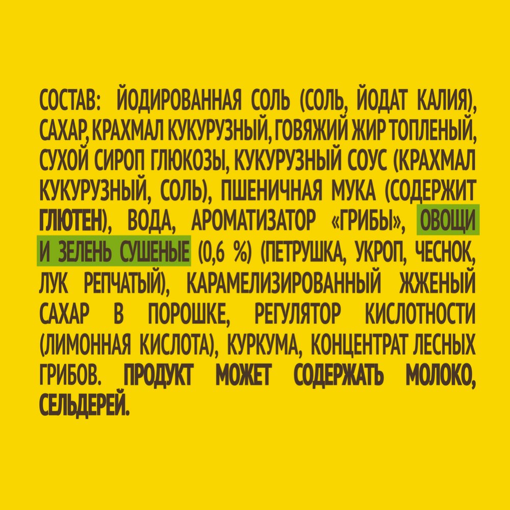 | Состав | йодированная соль (соль, йодат калия), сахар, крахмал кукурузный, говяжий жир топленый, сухой сироп глюкозы, кукурузный соус (крахмал кукурузный, соль), пшеничная мука (содержит глютен), вода, ароматизатор "грибы", овощи и зелень сушеные (0,6 %) (петрушка, укроп, чеснок, лук репчатый), карамелизированный жженый сахар в порошке, регулятор кислотности (лимонная кислота), куркума, концентрат лесных грибов (0,1 %).Продукт может содержать молоко, сельдерей. |