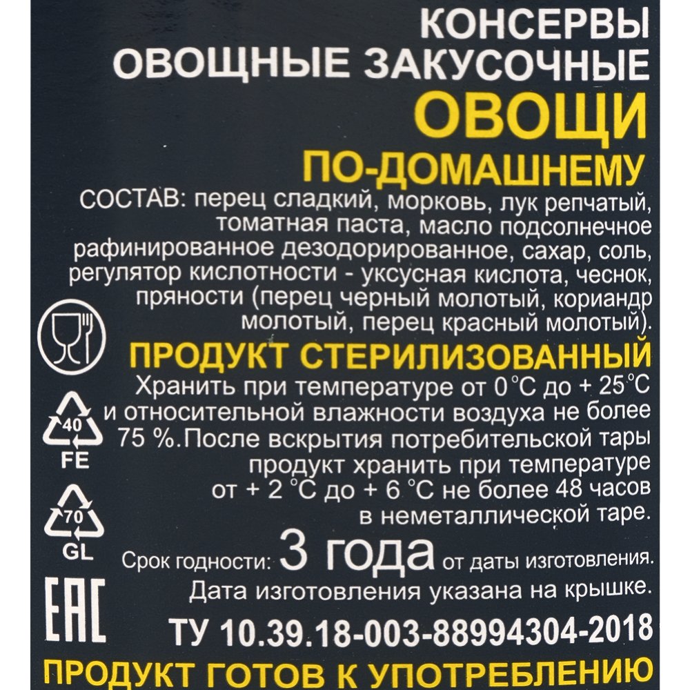 | Состав | перец сладкий, морковь, лук репчатый, томатная паста, масло подсолнечное рафинированное дезодорированное, сахар, соль, регулятор кислотности - уксусная кислота, чеснок, пряности (перец черный молотый, кориандр молотый, перец красный молотый). |