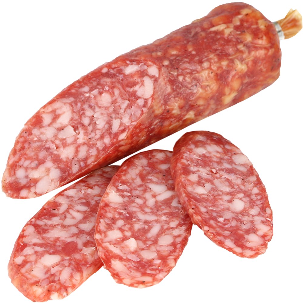 | Состав | свинина, шпик, говядина, жир-сырец свиной, соль, агент антислеживающий Е536, йодат калия, комплексная пищевая добавка (сахара (лактоза, декстроза, сахароза, сироп глюкозы), соль, агент антислеживающий Е536), пряности ( перец черный, горчица, тимьян), экстракты пряностей (мускат), регулятор кислотности Е575, усилитель вкуса и аромата Е621, антиокислитель Е316, перец черный молотый, перец душистый молотый, краситель Е120, ароматизатор, стартовая культура. Может содержать следы сои, лактозы, сельдерея, глютена, орехов, рыбы, кунжута, диоксида серы и сульфитов, ракообразных. |