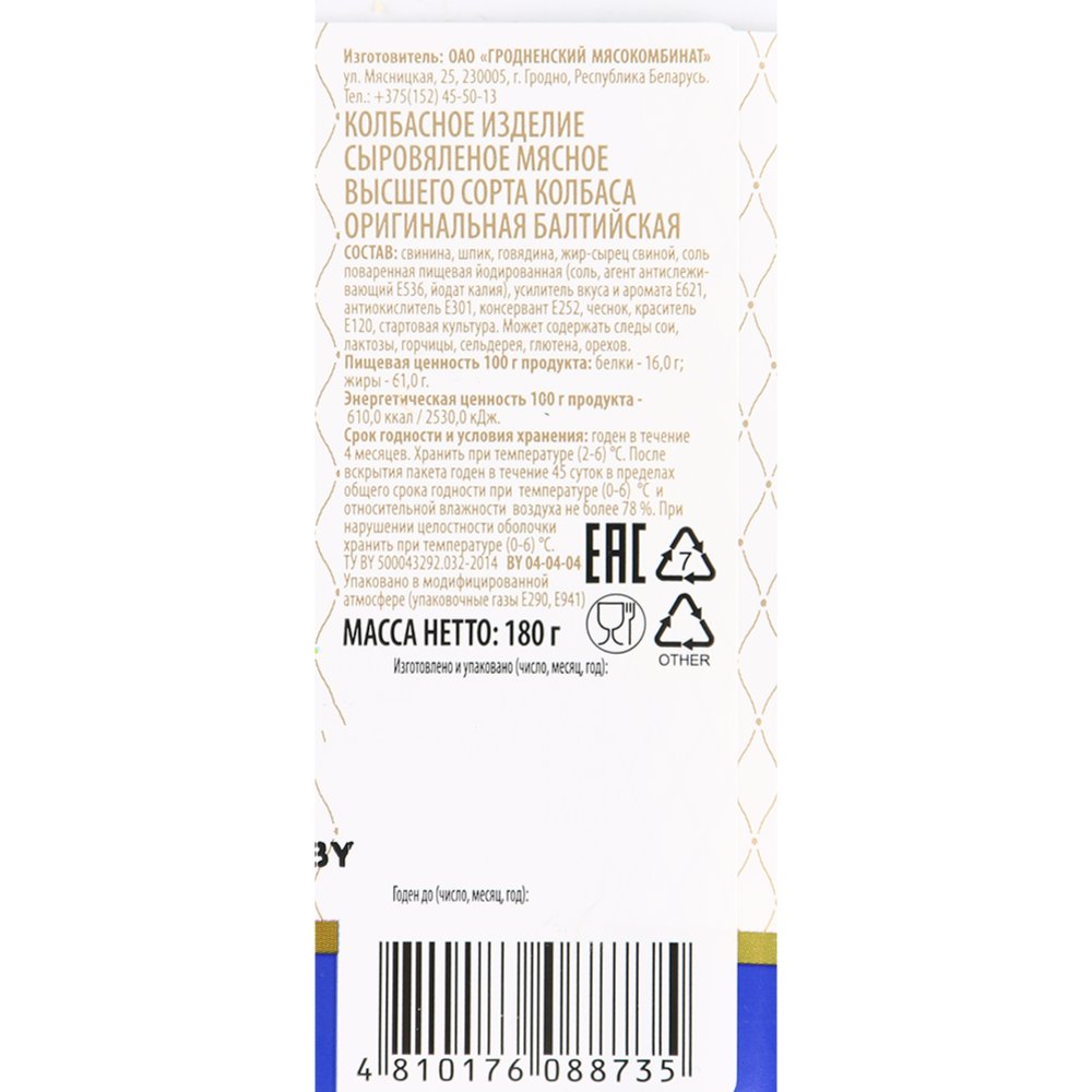 | Производитель | ОАО "Гродненский мясокомбинат" г. Гродно, ул. Мясницкая,26, Республика Беларусь. |