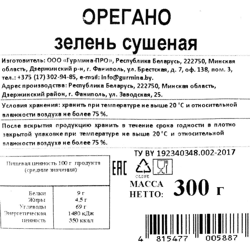 | Производитель | ООО «Гурмина-ПРО» 222750, Минская область, Дзержинский район, г. Фаниполь, ул. Брестская, д. 7, оф. 138, пом. 3, Республика Беларусь. |