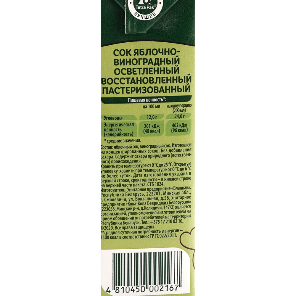 | Состав | яблочный сок, виноградный сок. Изготовлен из концентрированных соков. Без добавления сахара. Содержит сахара природного (естественного) происхождения. |