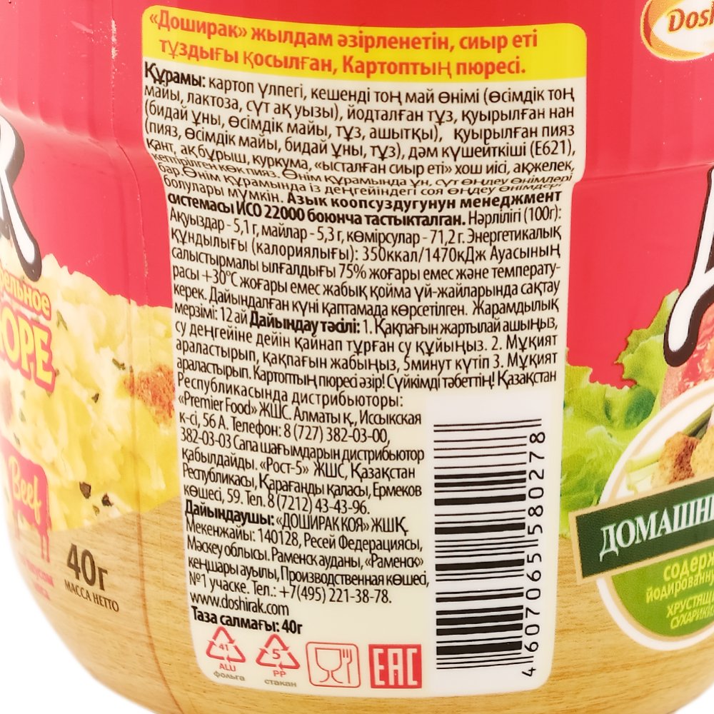 | Состав | картофельные хлопья, продукт комплексный жировой (жир растительный, лактоза, молочный белок), соль йодированная, гренки (мука пшеничная, масло растительное, соль, дрожжи), лук жареный (лук, масло растительное, мука пшеничная, соль), усилитель вкуса Е621, сахар, чеснок сушеный, куркума, ароматизатор Копченая говядина, петрушка, лук сушеный зеленый. |
