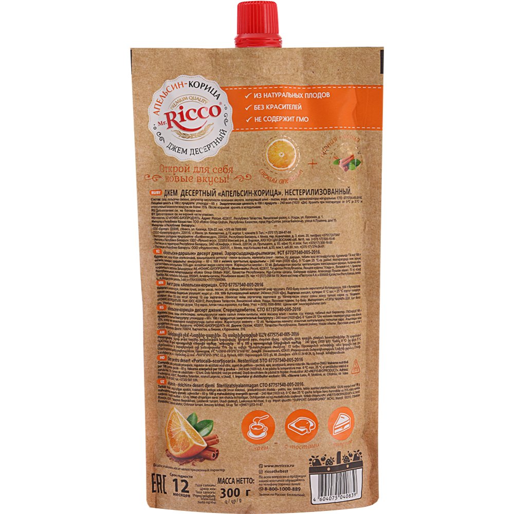| Состав | сахар, апельсины свежие, желирующий агент - пектин, регулятор кислотности лимонная кислота, вода, корица, ароматизаторы натуральные. |